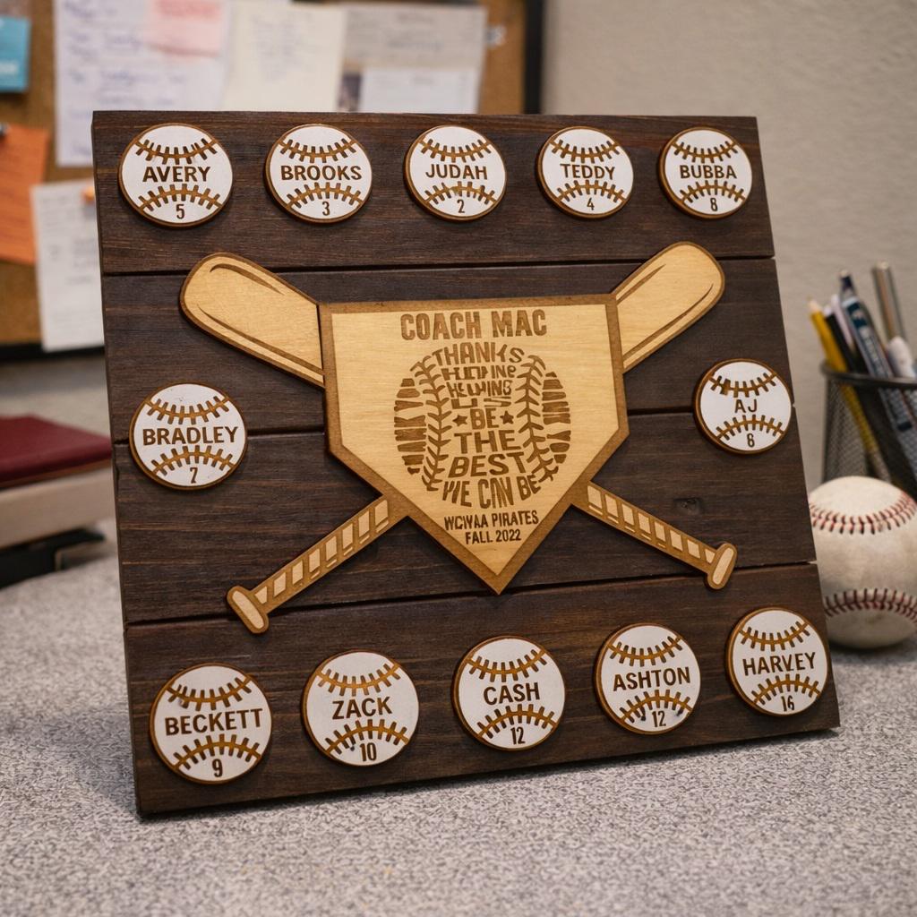 Looking for a meaningful end of season baseball coach gift? This personalized wooden coach award is custom engraved with your team’s player names, numbers, and a thank you message—creating a keepsake coaches proudly display long after the season ends.