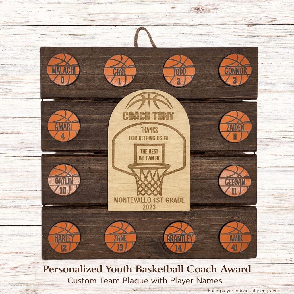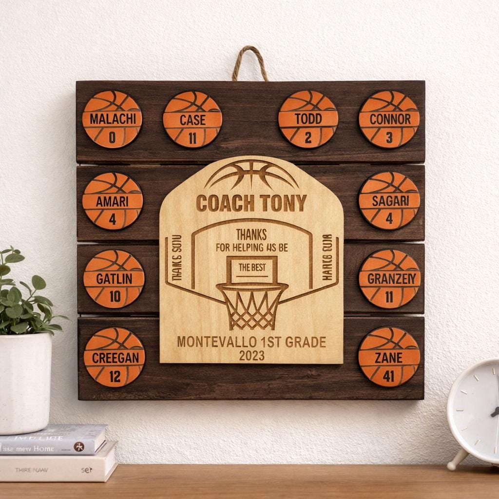 Express your gratitude to that exceptional basketball coach with a personalized wooden basketball-themed plaque designed to convey your heartfelt appreciation. This meticulously laser-cut decorative plaque is a fitting end-of-season gift for teams of all sizes, making it a memorable token of your thanks.