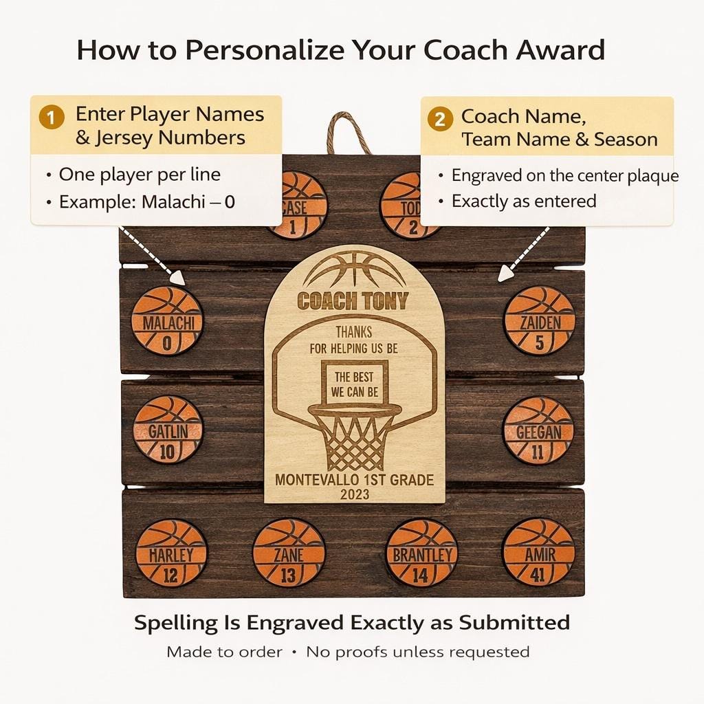 Personalized Team Details: The backboard area is laser engraved with the coach's name, team name, and season, adding a personal touch to the award.