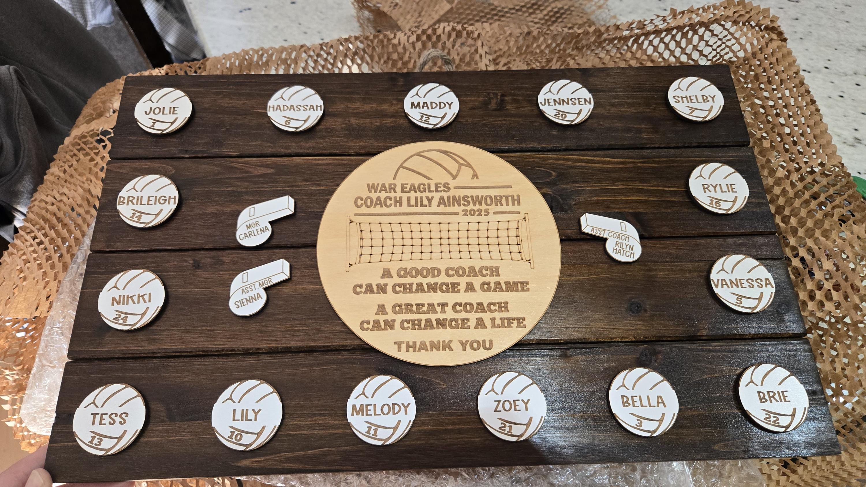 Personalized wooden volleyball-themed plaque to say "Thank You" to that special coach. Laser-cut decorative pieces are mounted on a square or rectangular wooden pallet-style plaque. Each volleyball contains a player's name from your team. The net is engraved with the coach's name, team name, and season. Assistant coach names can be engraved on the optional coach whistles. Light-weight design easily mounts to walls or doors or set on a bookshelf. This coaches award makes a perfect end-of-the-season gift. Now available in a 11" x 17" version for large teams (15 + players). Message us with special requests; we are flexible with our designs.