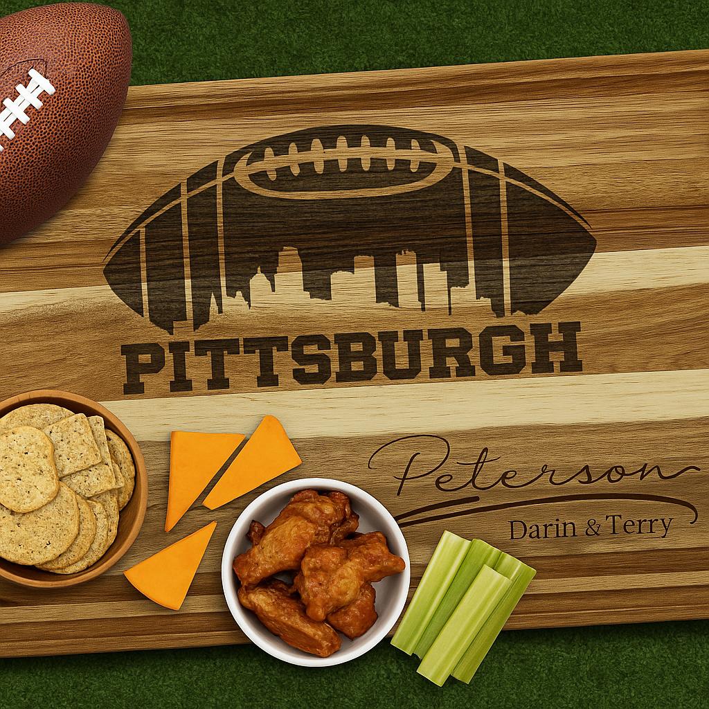 Looking for a thoughtful and unique gift for the Pittsburgh football fan in your life? How about that perfect accessory for your Super Bowl party? Our custom cutting boards are the perfect choice! Crafted from sustainable acacia wood, these cutting boards add a touch of elegance to any kitchen. Personalized with precision using our laser engraving process, they make a memorable and functional gift for various occasions.