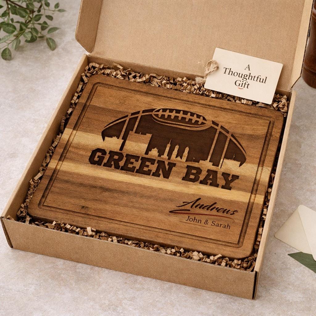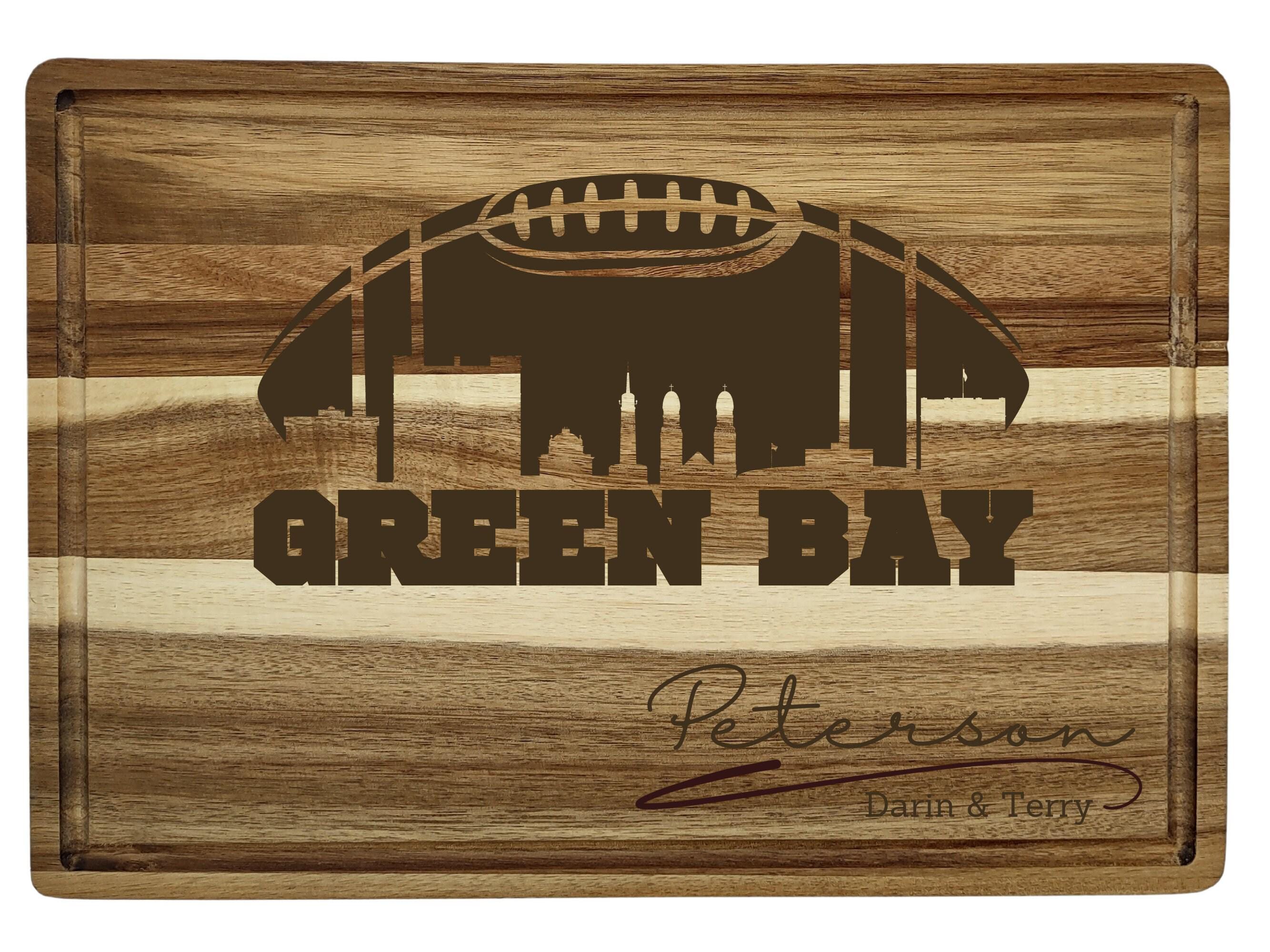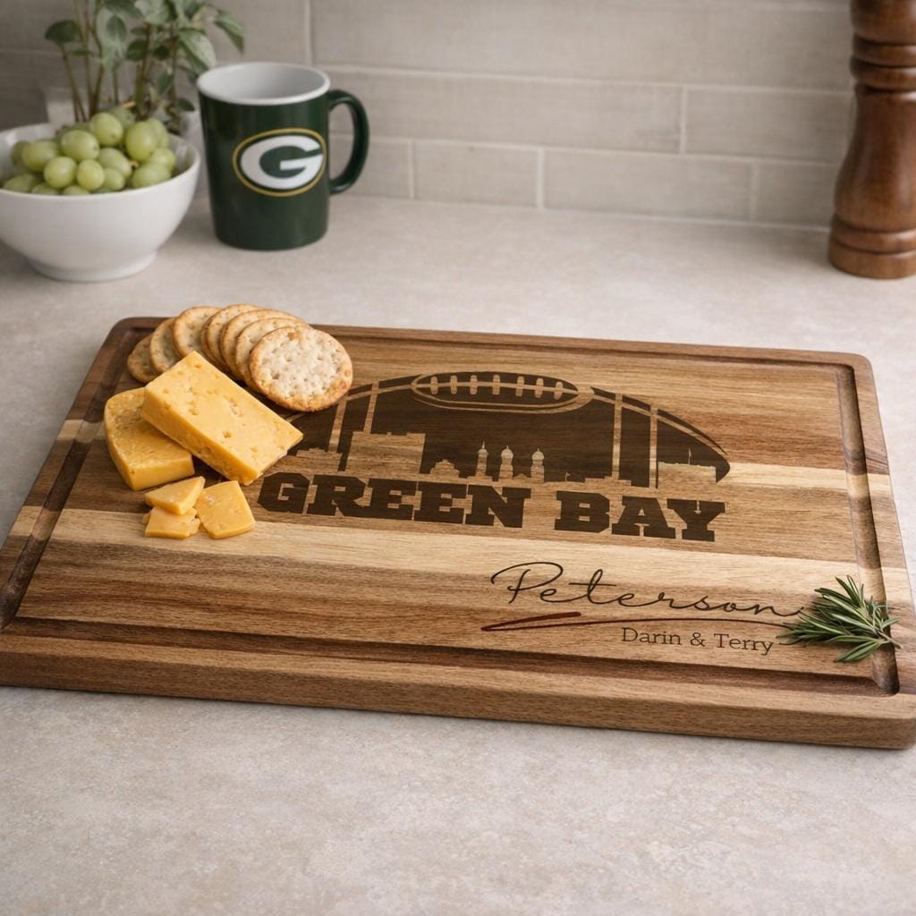 Make your Green Bay football gift truly special with a personalized acacia wood cutting board that is both functional and meaningful.