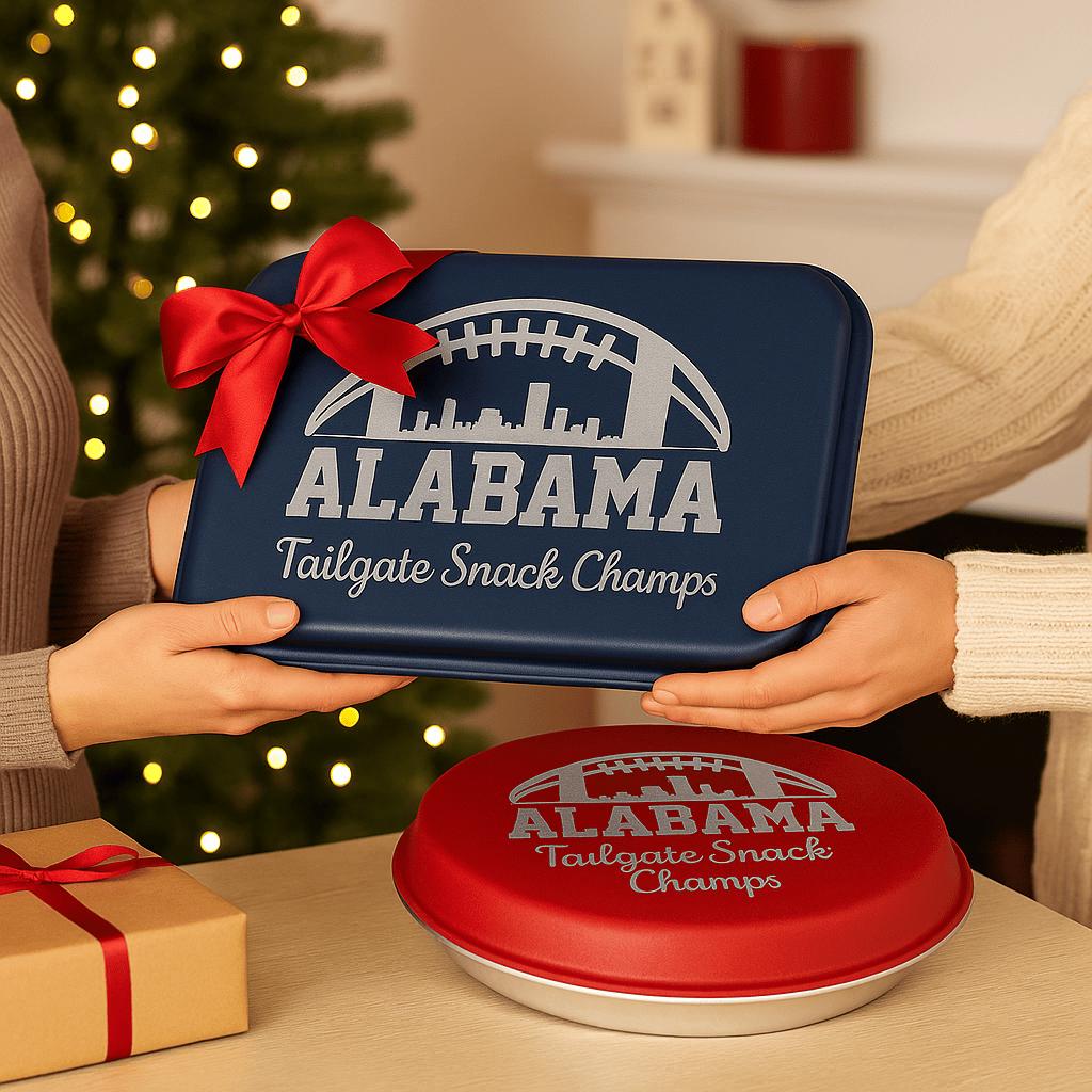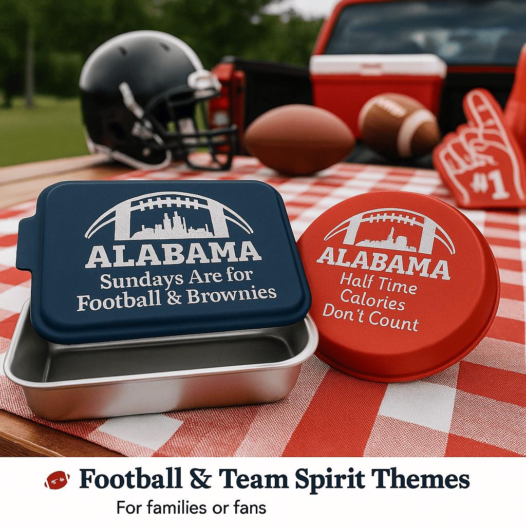 Celebrate your Alabama football pride — in the kitchen! Our Personalized Alabama Football Cake Pan & Pie Tin combines function, style, and team spirit. Each durable powder-coated aluminum pan features a laser-engraved football design with the Alabama skyline — customized with your name, date, or special message.