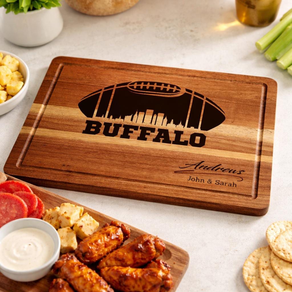 Whether it’s for game-day spreads, tailgates, Super Bowl parties, or a meaningful holiday gift, this Personalized Buffalo Football Cutting Board delivers both style and function.