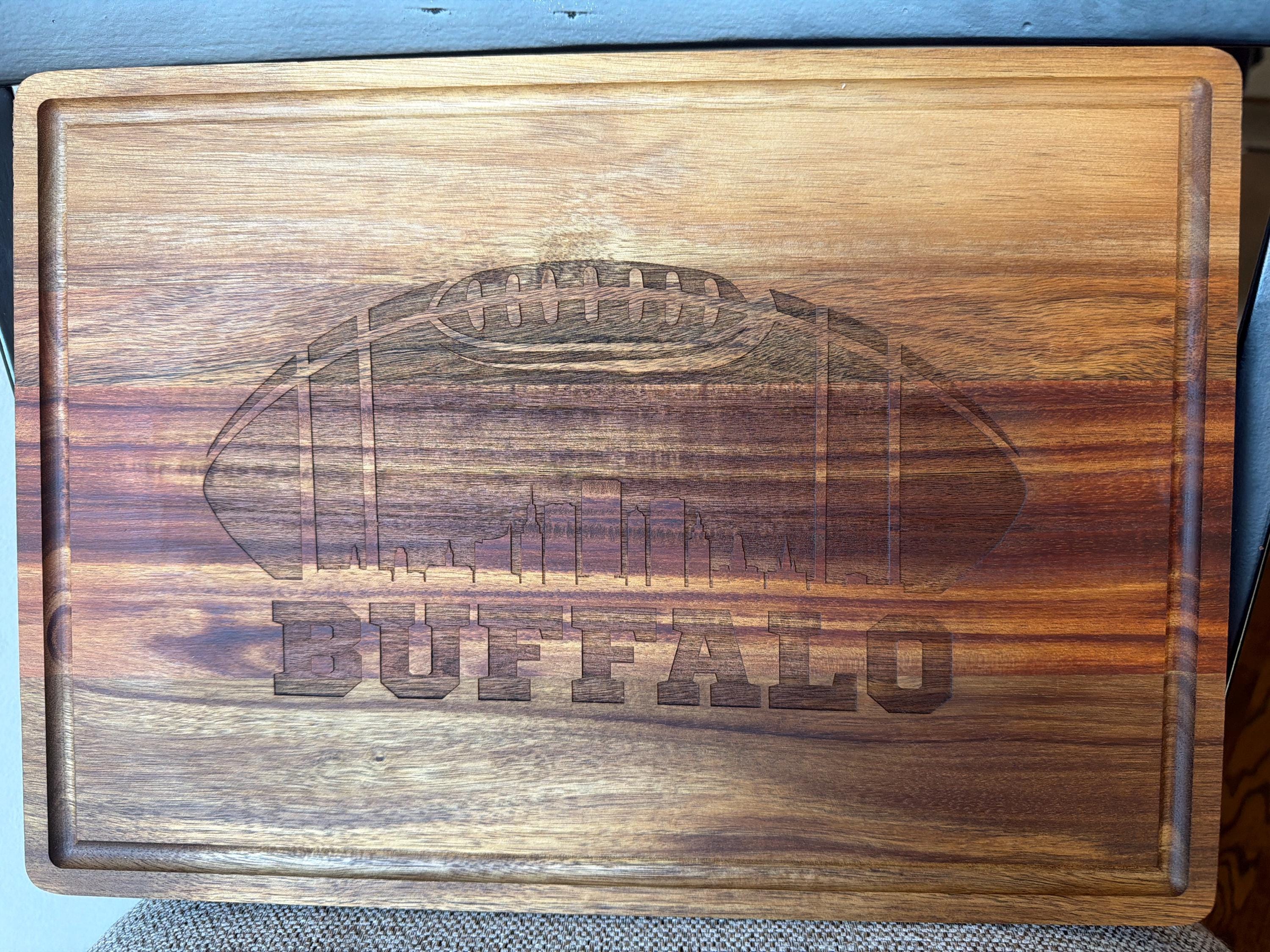 Crafted from rich, sustainable acacia wood, each board is laser-engraved with precision to showcase your personalization — names, dates, or special messages that celebrate Buffalo pride. With its heavy-duty build, deep juice groove, and side handles, it’s as functional as it is beautiful.