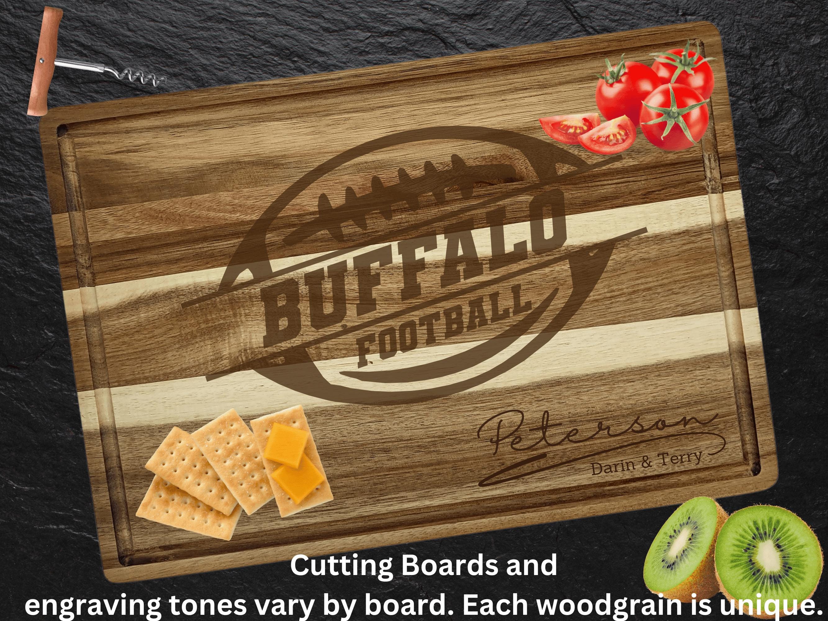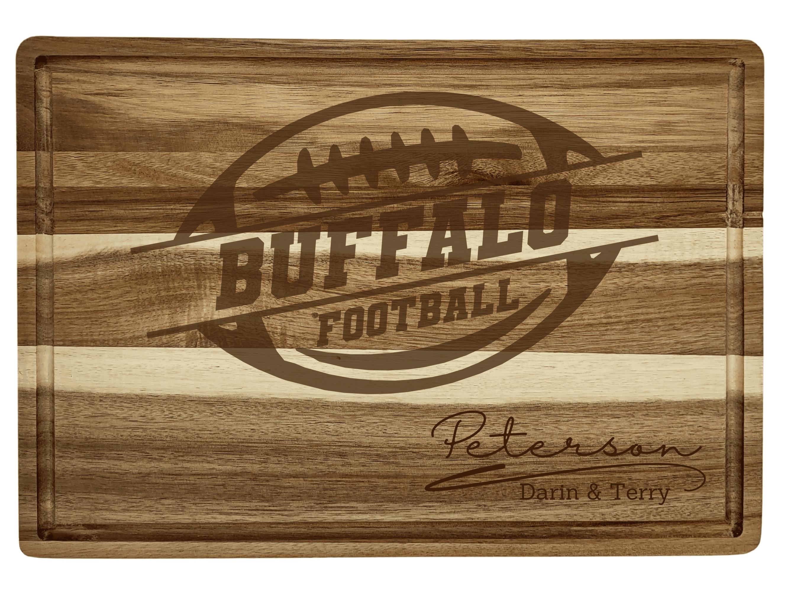 Crafted from rich, sustainable acacia wood, each board is laser-engraved with precision to showcase your personalization — names, dates, or special messages that celebrate Buffalo pride. With its heavy-duty build, deep juice groove, and side handles, it’s as functional as it is beautiful.