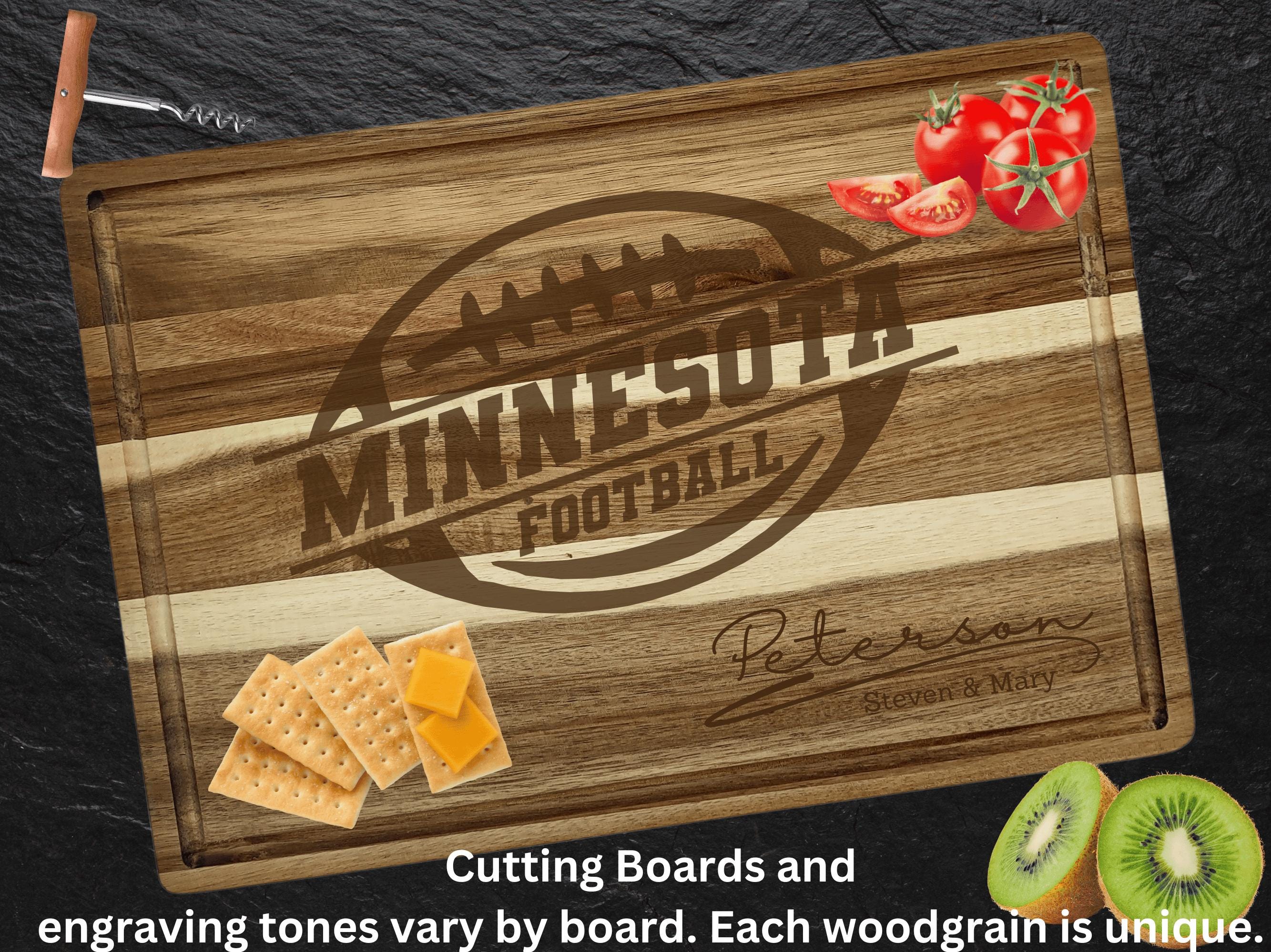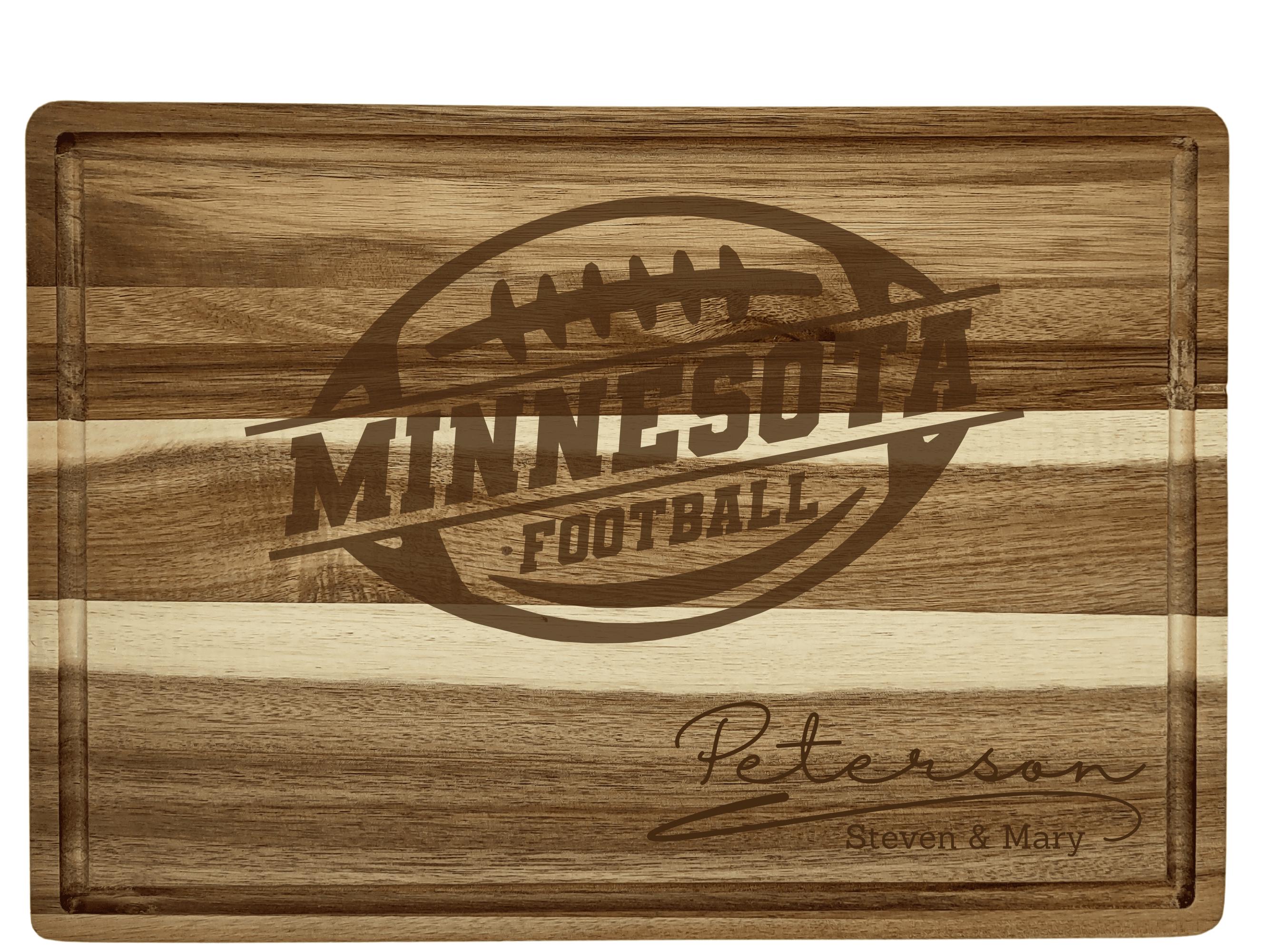 Crafted from rich, sustainable acacia wood, each board is laser-engraved with precision to showcase your personalization — names, dates, or special messages that celebrate Minnesota pride. With its heavy-duty build, deep juice groove, and side handles, it’s as functional as it is beautiful.