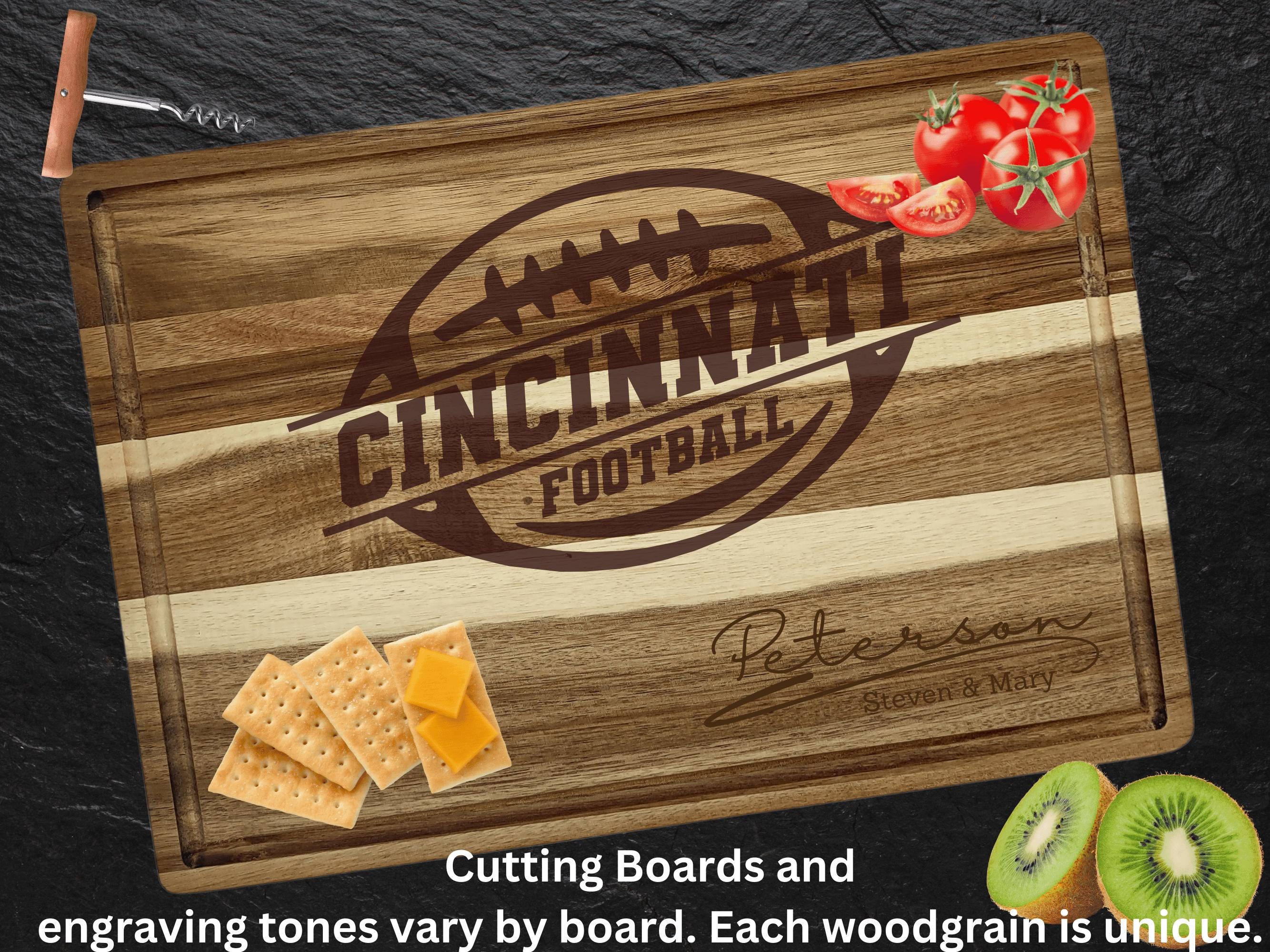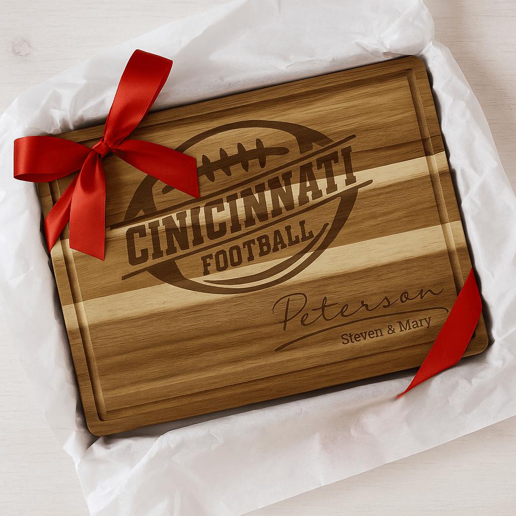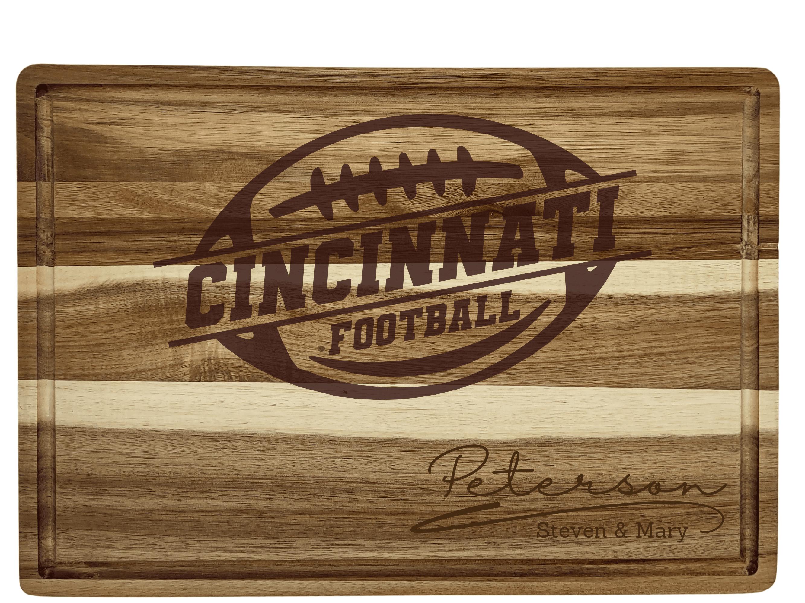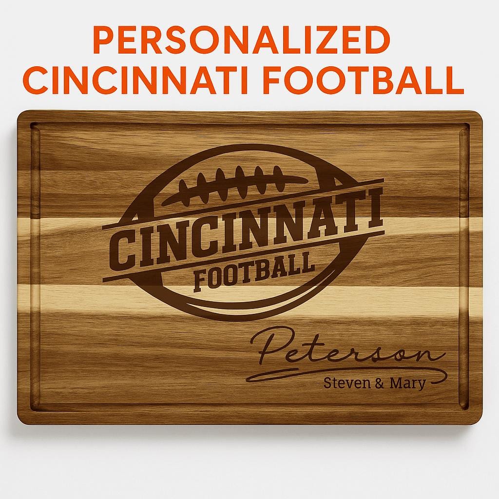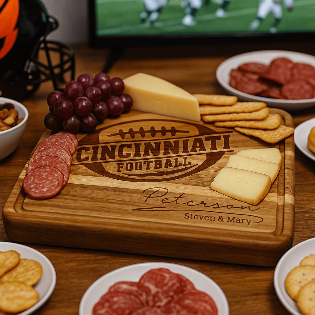 Personalized Cincinnati football cutting board made from durable acacia wood — a custom laser engraved game day serving board that’s perfect for tailgating, kitchen décor, and hosting watch parties all season long. This Cincinnati football charcuterie and cutting board brings team spirit into your home while offering long-lasting everyday functionality.