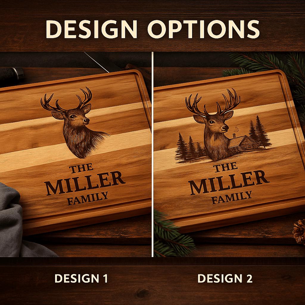 Looking for the perfect hunter gift or rustic kitchen décor piece? Our personalized acacia wood cutting boards feature two deer-hunter design options and precision laser engraving for a truly unique and functional keepsake.