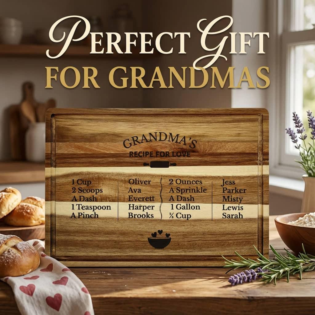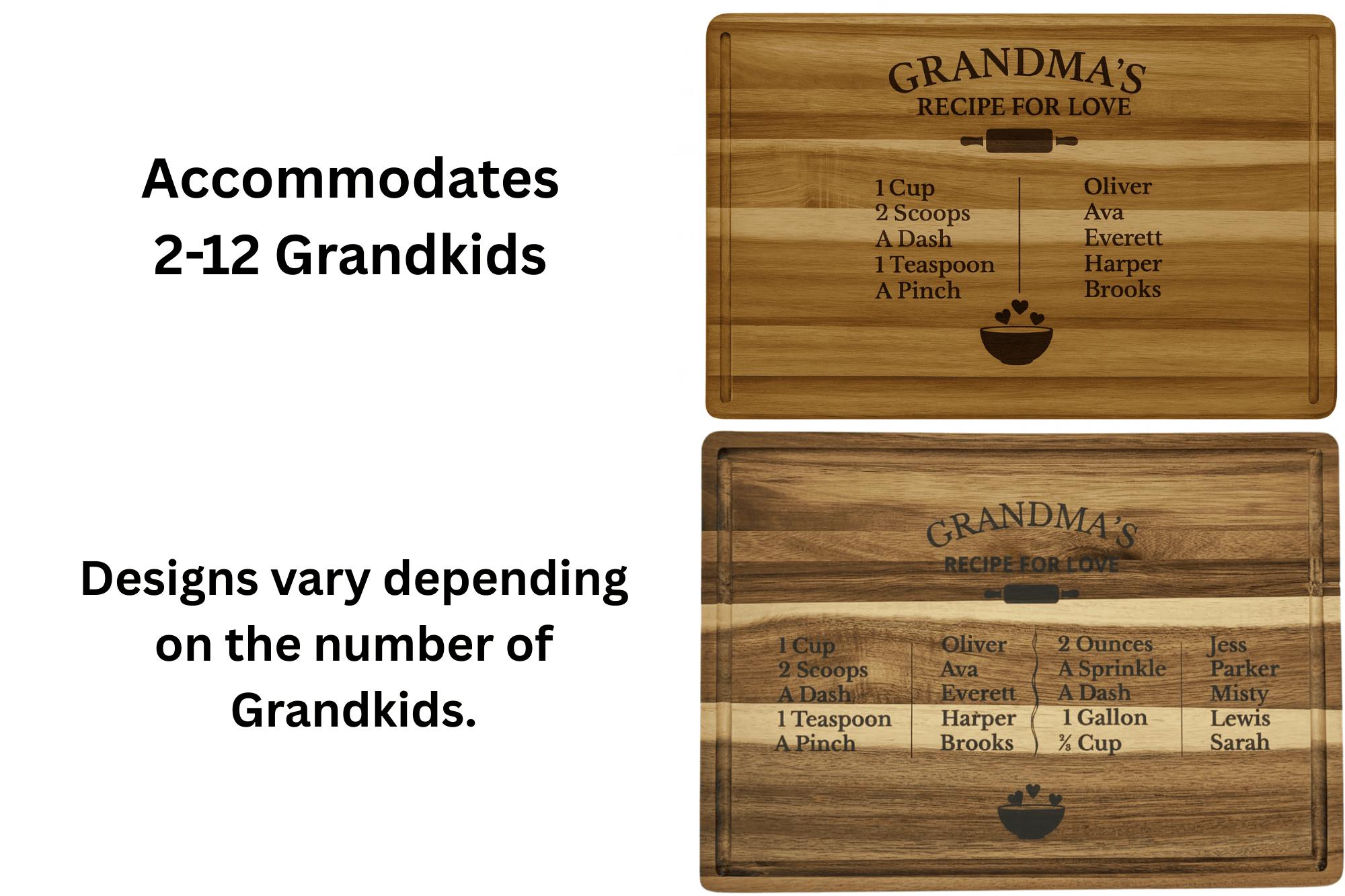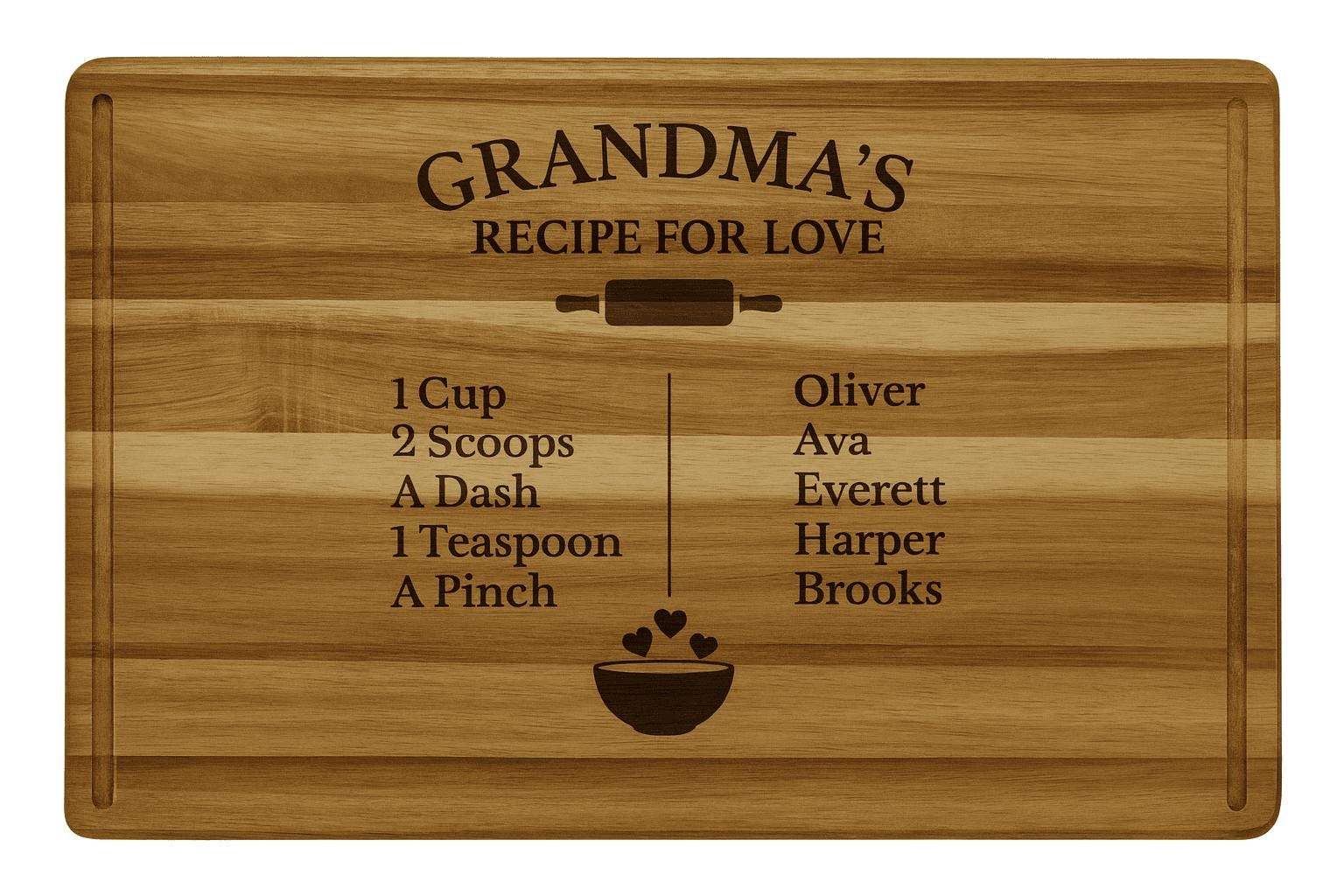 Our Recipe for Love personalized cutting board is the perfect gift for Grandma, Nana, Gigi, Mom, Mimi, Abuela, or any special cook in your life. Crafted from premium acacia wood, each board is professionally engraved with your chosen title and the names of her cherished grandkids — creating a one-of-a-kind keepsake she’ll display proudly.