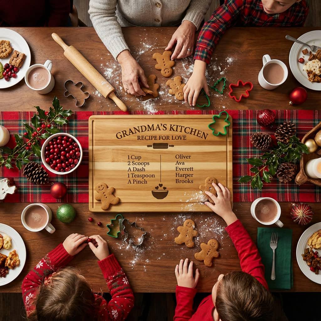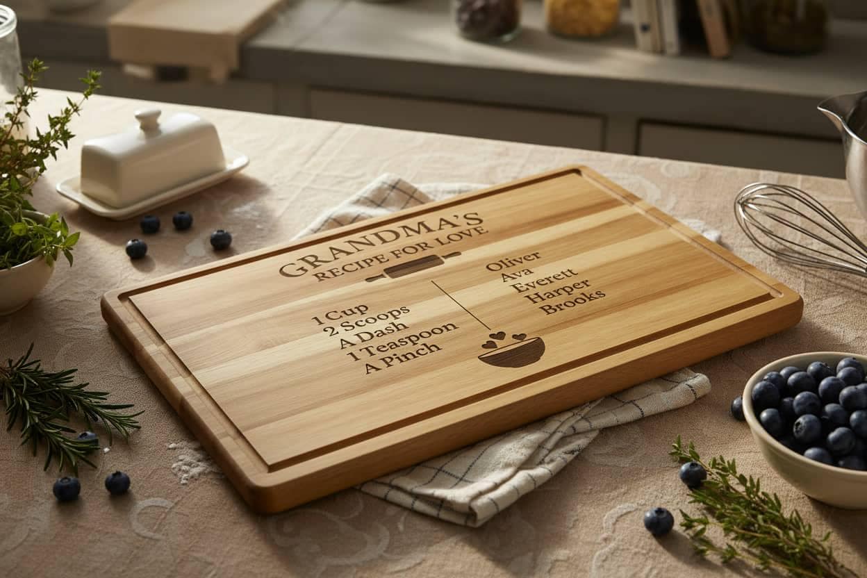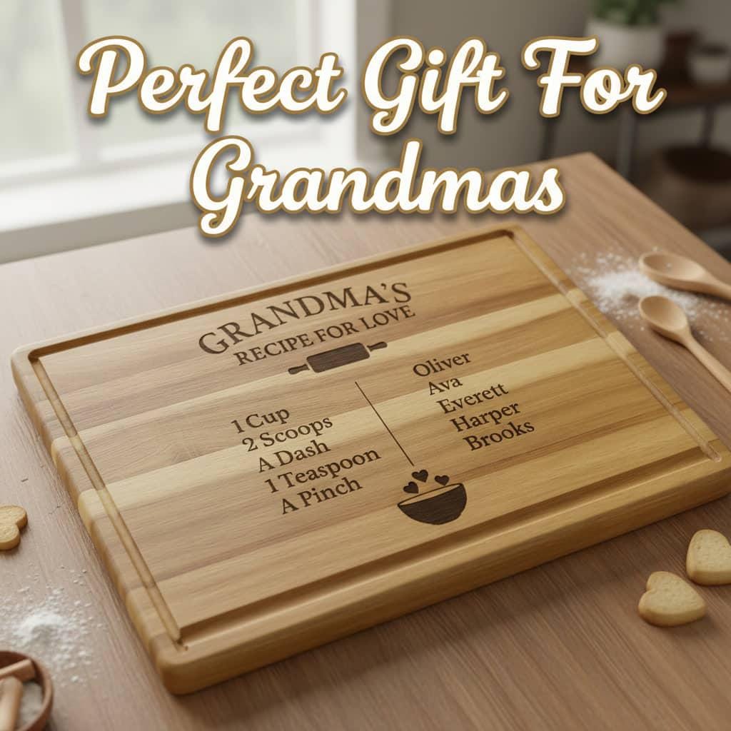 Our Recipe for Love personalized cutting board is the perfect gift for Grandma, Nana, Gigi, Mom, Mimi, Abuela, or any special cook in your life. Crafted from premium acacia wood, each board is professionally engraved with your chosen title and the names of her cherished grandkids — creating a one-of-a-kind keepsake she’ll display proudly.