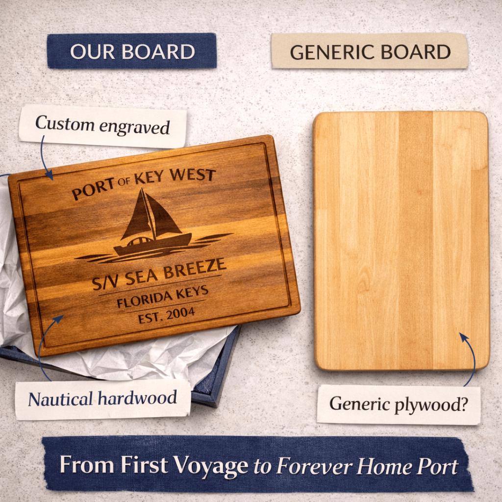 Whether it’s a retirement gift for a captain, a wedding gift for sailing couples, an anniversary present, or a housewarming for a coastal home, this custom nautical cutting board celebrates the place that started your journey — your home harbor.