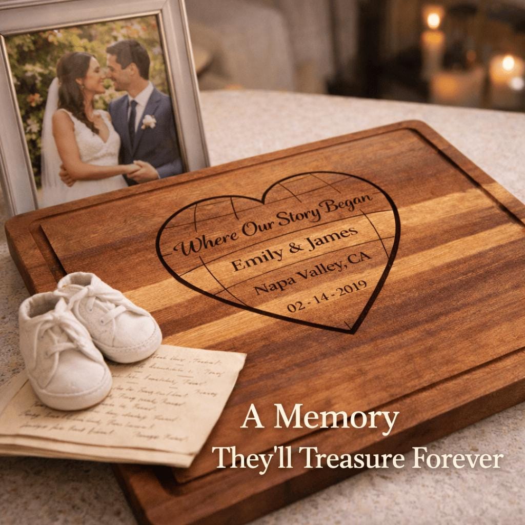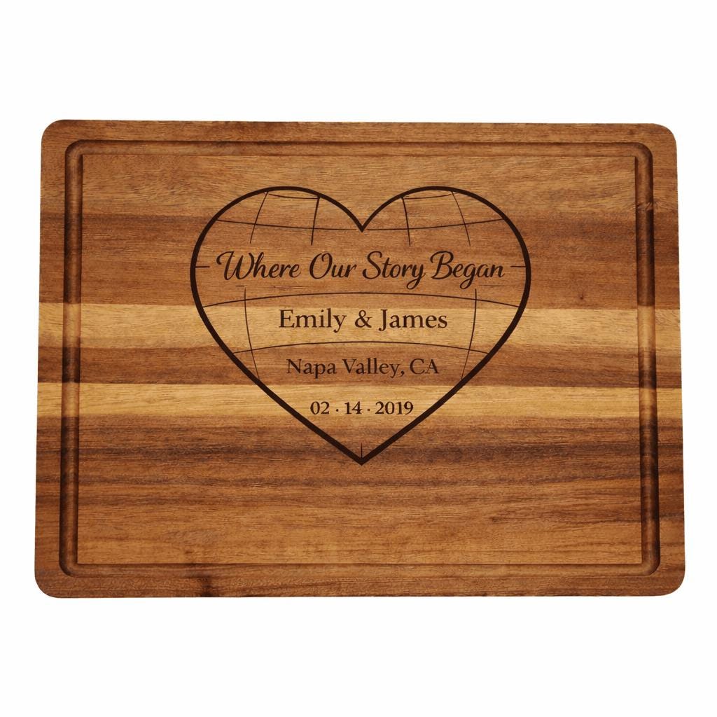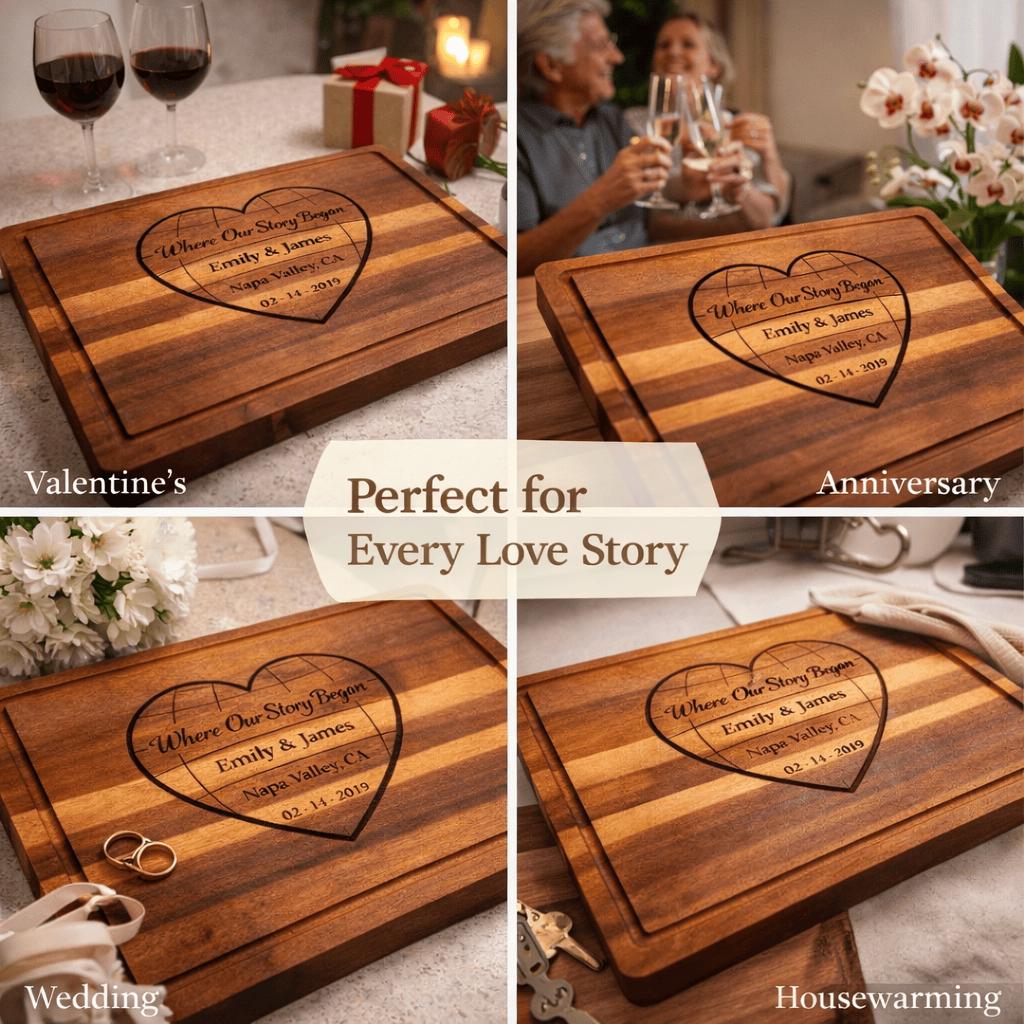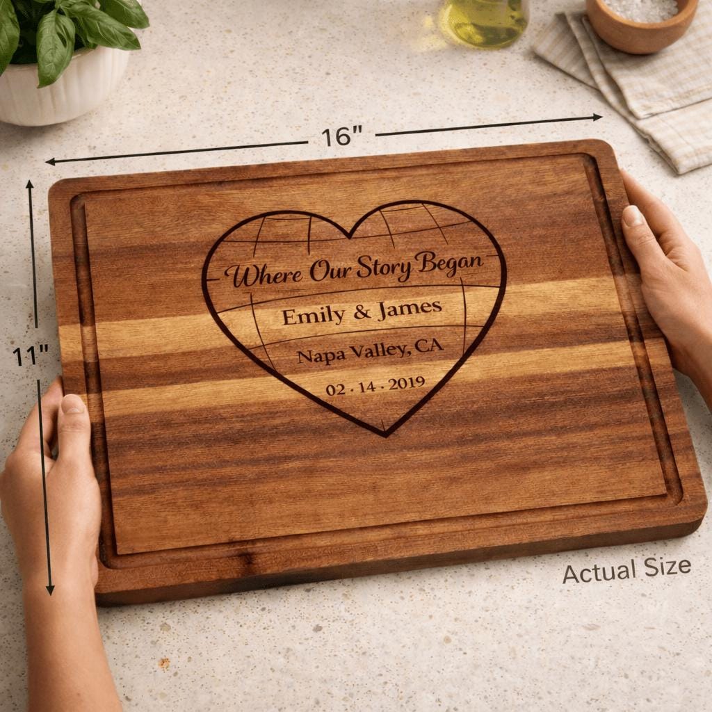 This custom engraved hardwood cutting board features a romantic heart design with the phrase “Where Our Story Began,” beautifully personalized with your names, special location, and meaningful date. Whether it’s where you met, got engaged, or said “I do,” this board turns your story into an heirloom.