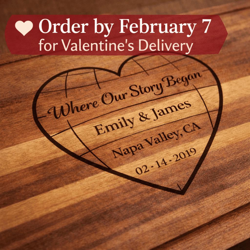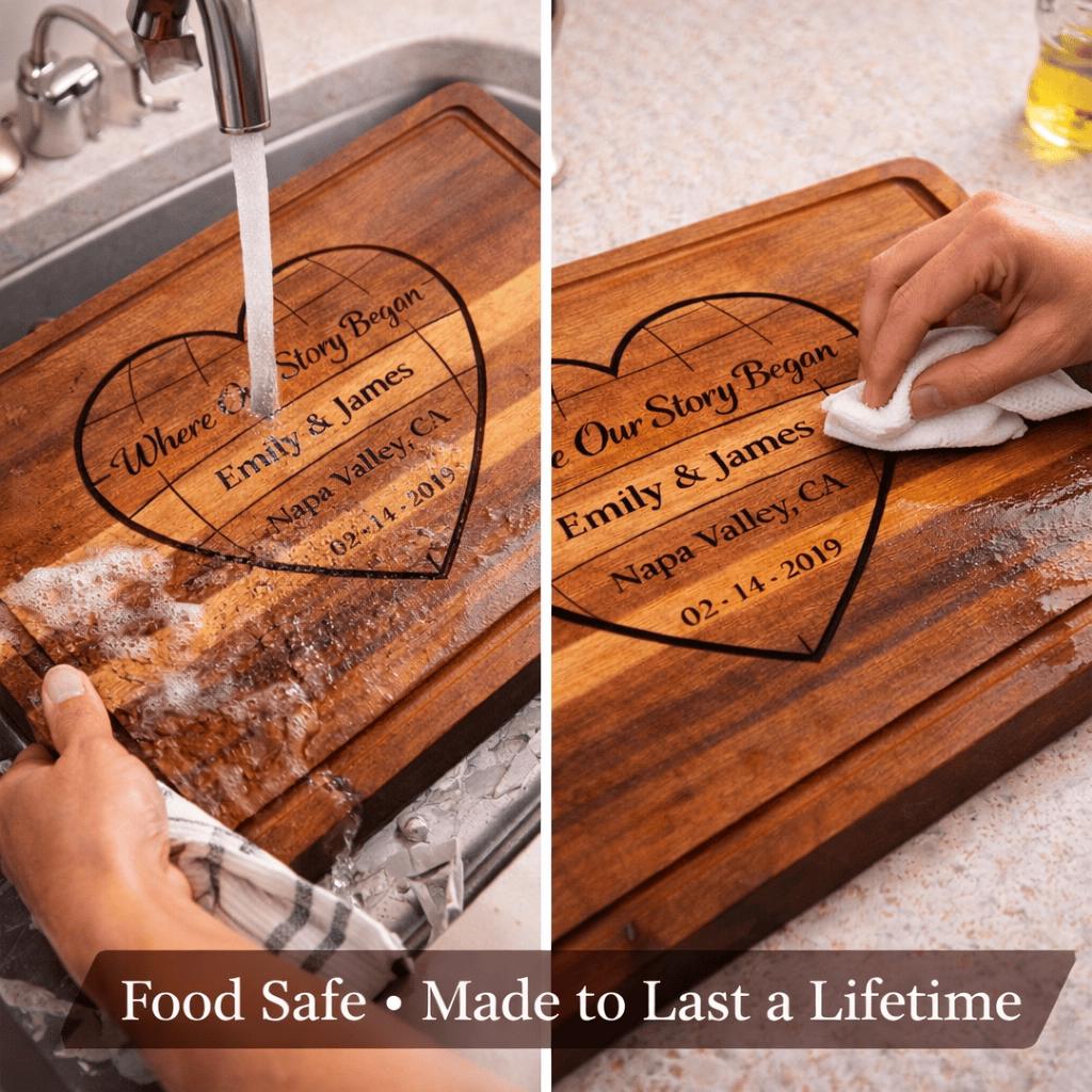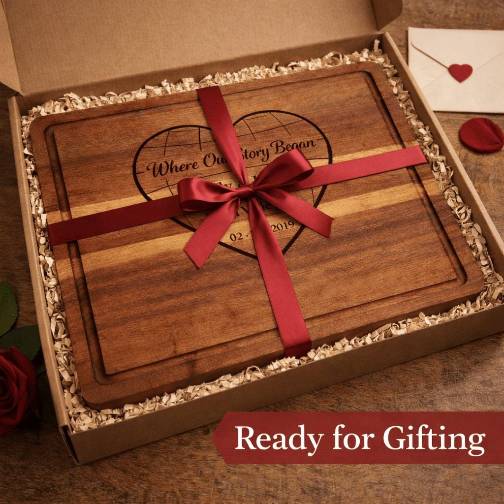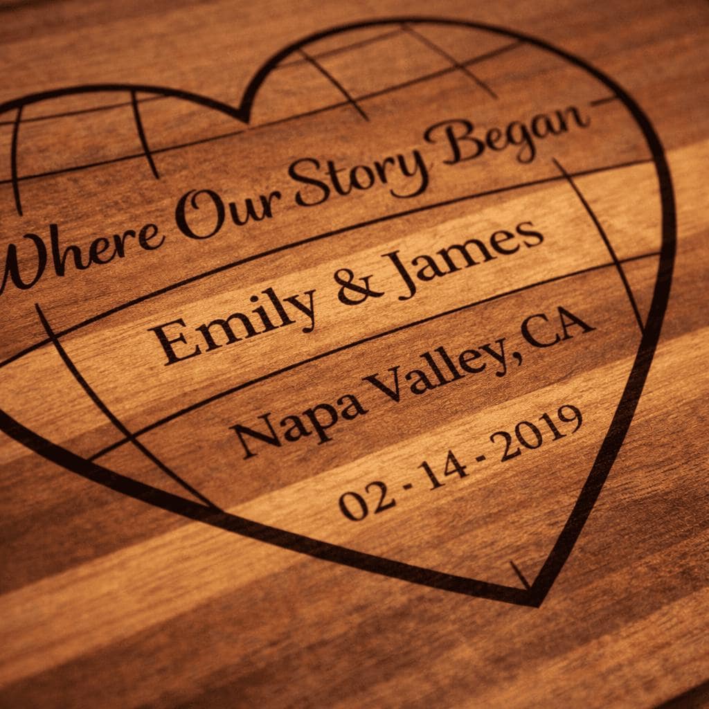 This custom engraved hardwood cutting board features a romantic heart design with the phrase “Where Our Story Began,” beautifully personalized with your names, special location, and meaningful date. Whether it’s where you met, got engaged, or said “I do,” this board turns your story into an heirloom.