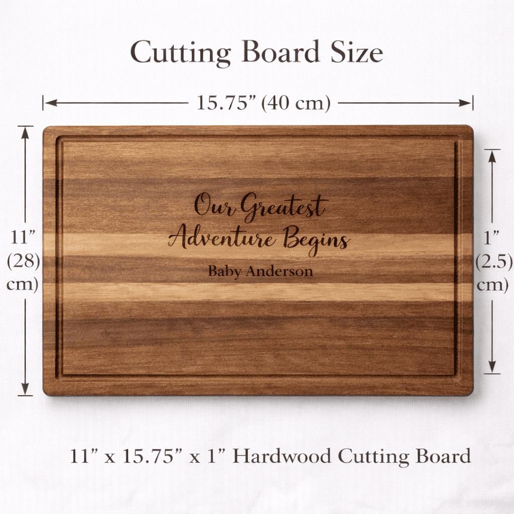 🪵 A Personalized Engraved Cutting Board — a timeless kitchen heirloom engraved with “Our Greatest Adventure Begins” and Baby’s name.