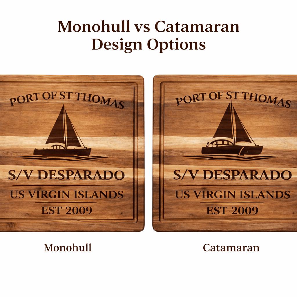 Bring the spirit of the Caribbean into your galley with a personalized St Thomas sailboat cutting board, custom engraved with your boat name, home port, and established year. Designed for sailors, yacht owners, and ocean lovers, this premium solid acacia wood cutting board is both a functional galley essential and a meaningful nautical keepsake.