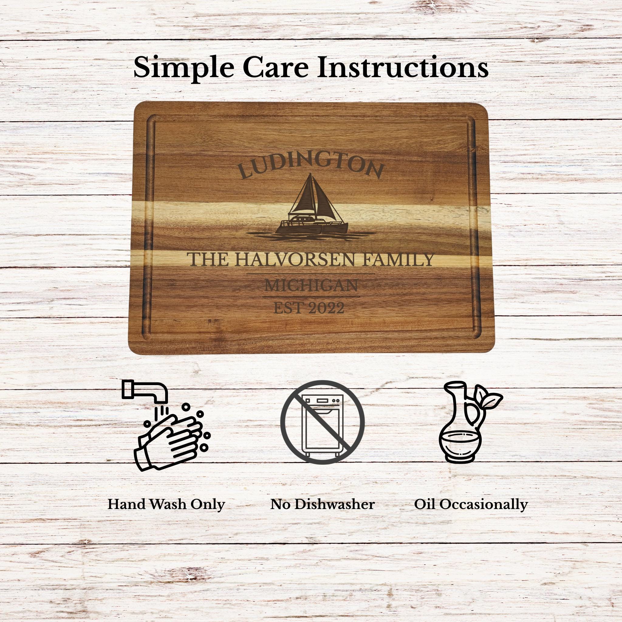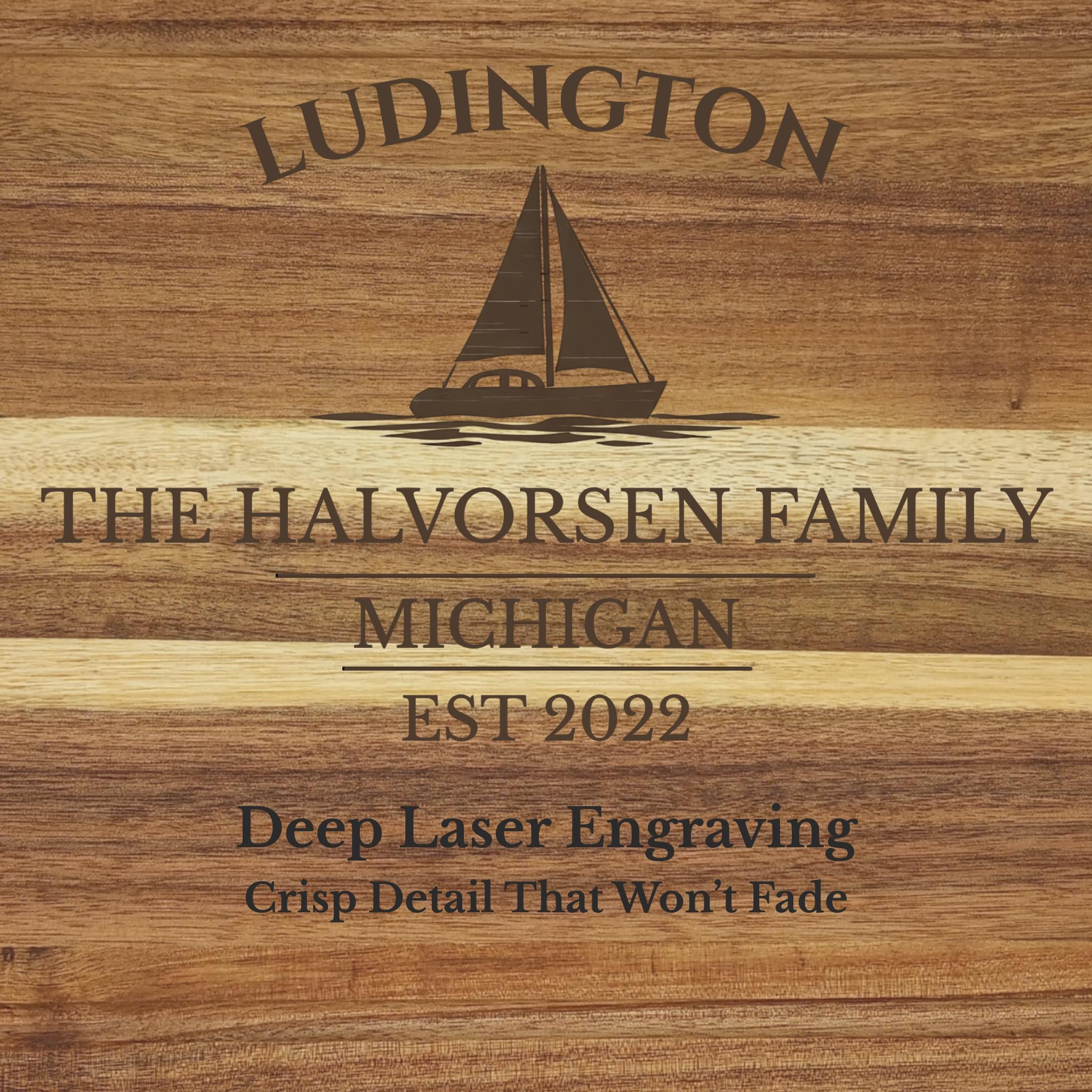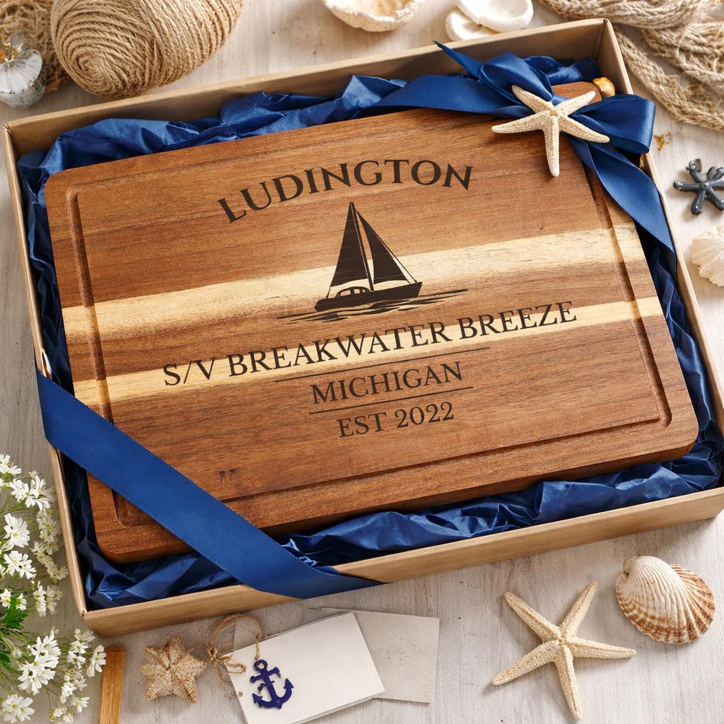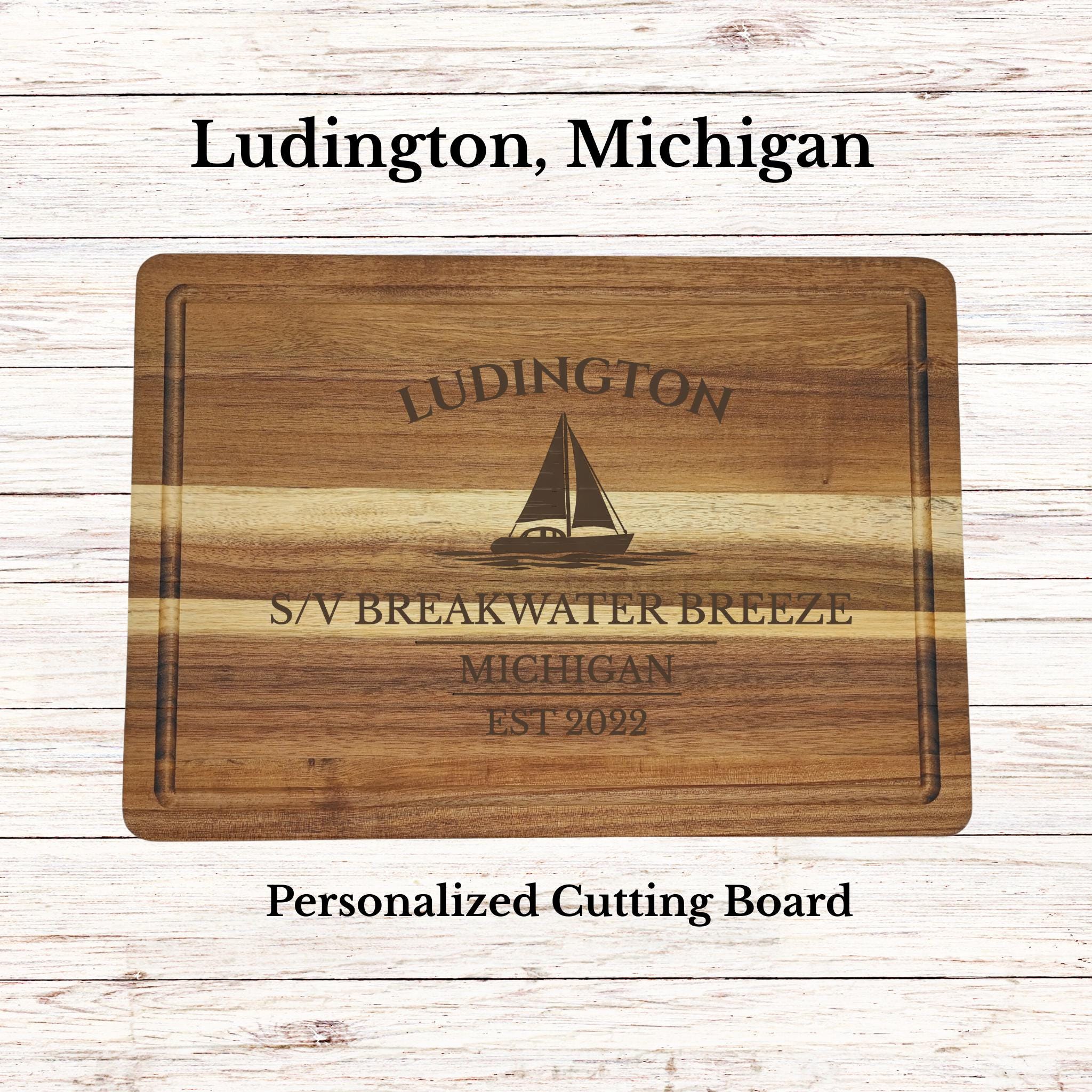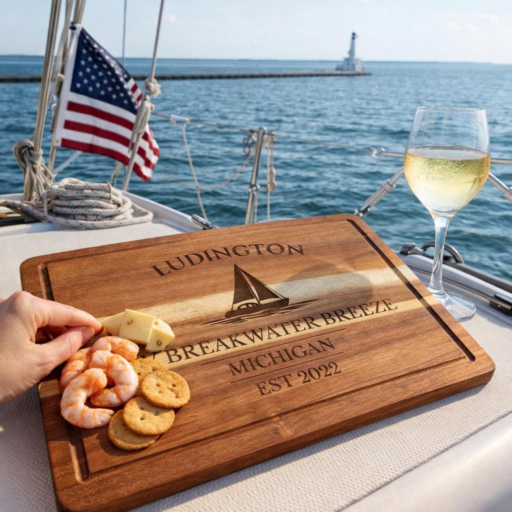 Bring the relaxed coastal charm of Ludington into your home with a personalized sailboat cutting board inspired by one of Lake Michigan’s most scenic harbor towns.