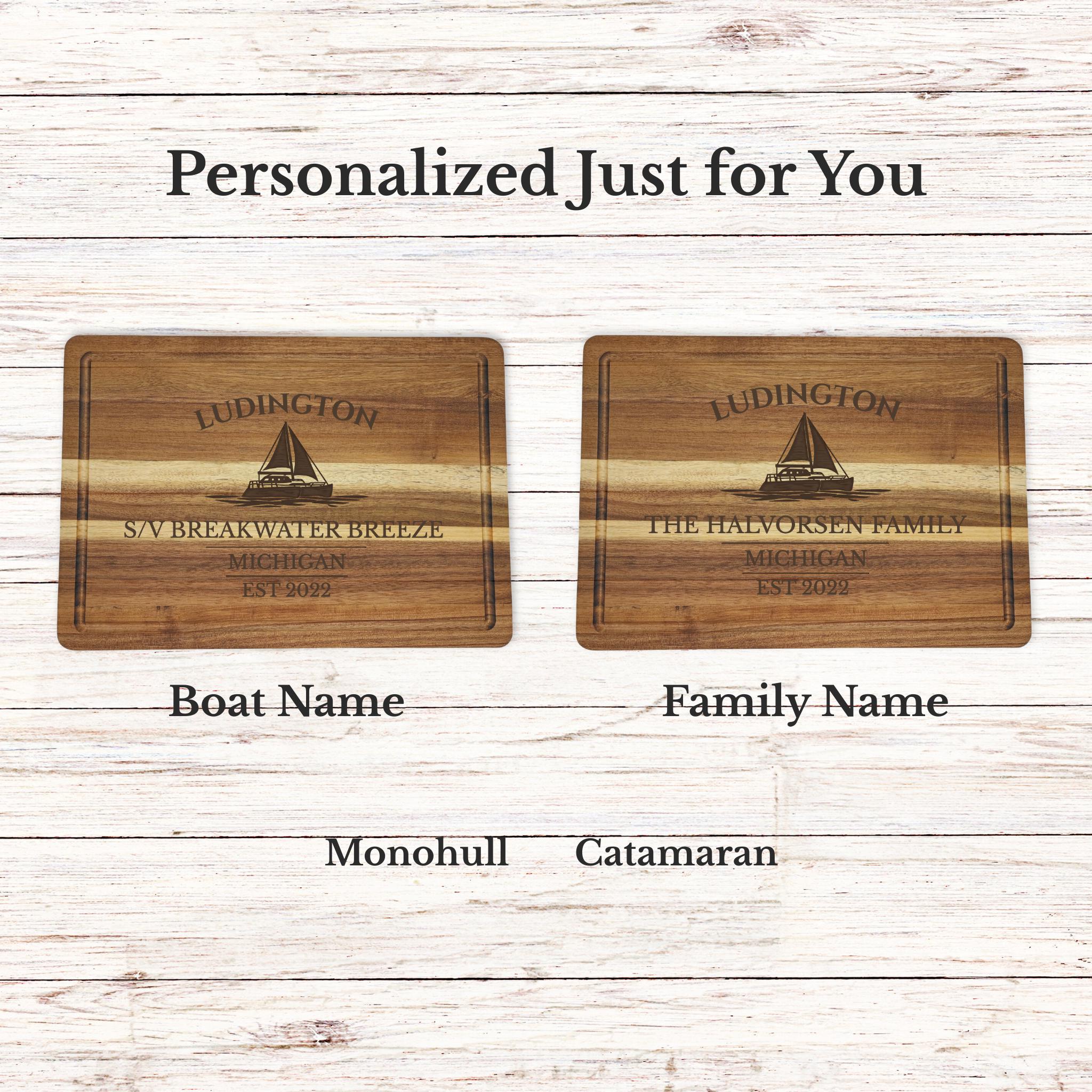 Custom engraved with your boat name, Ludington, Michigan, and established year. Choose monohull or catamaran to match your vessel.