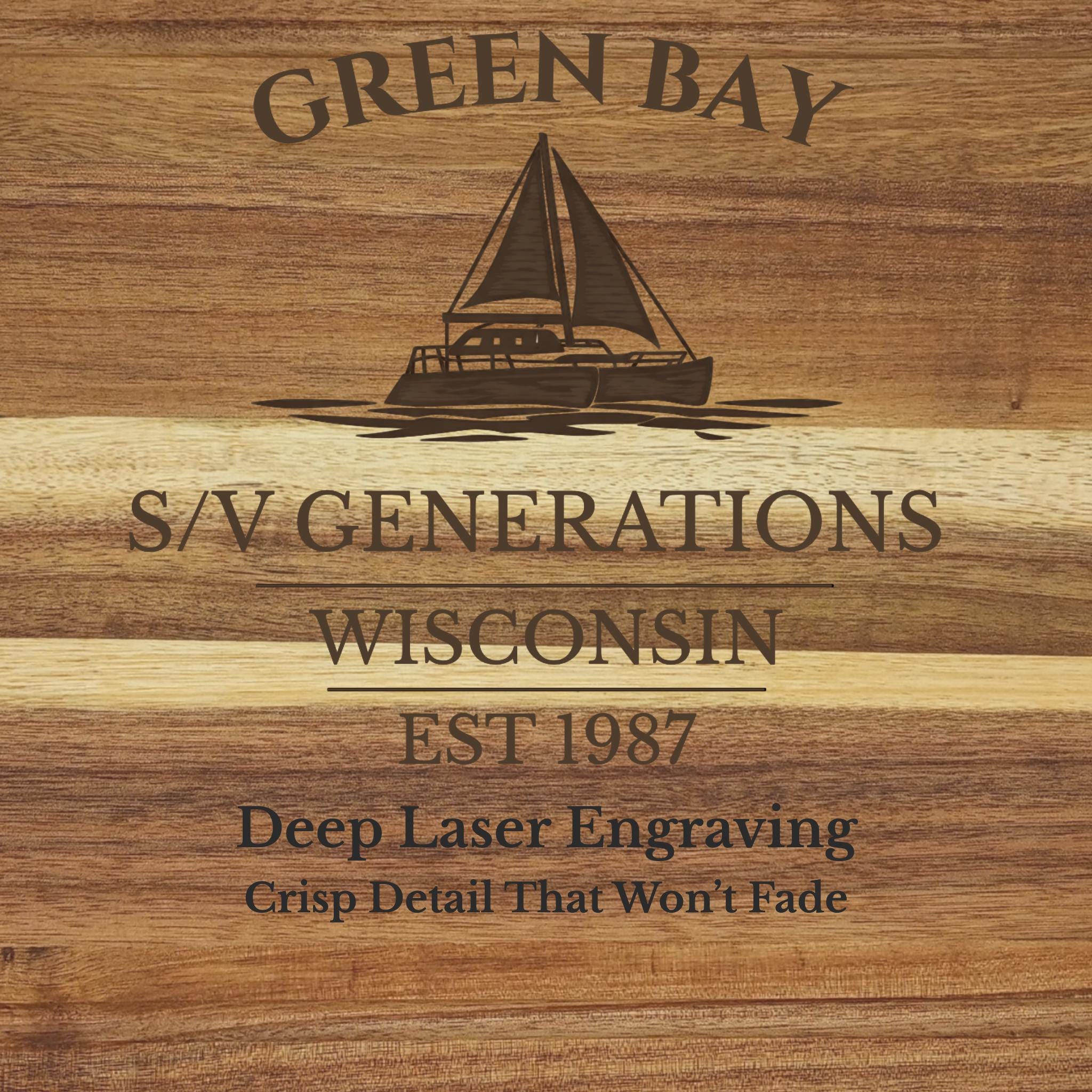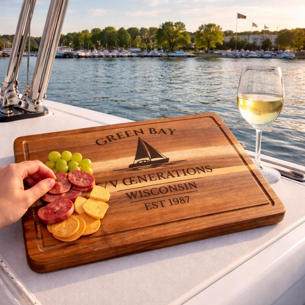 Custom engraved with your boat name, family name, and established year, this board reflects life along the waters of Green Bay — where boating, tailgating traditions, and deep-rooted Wisconsin pride come together.