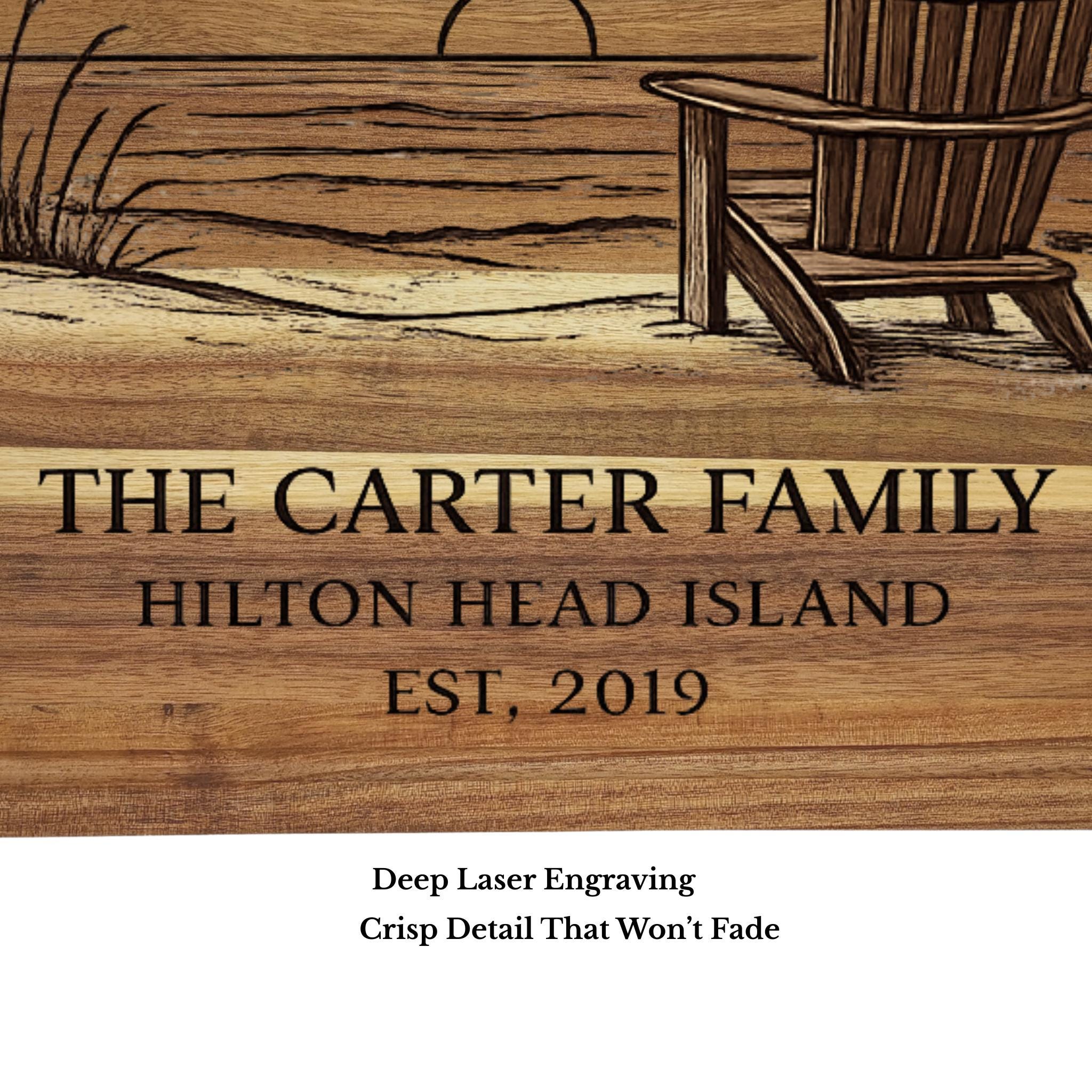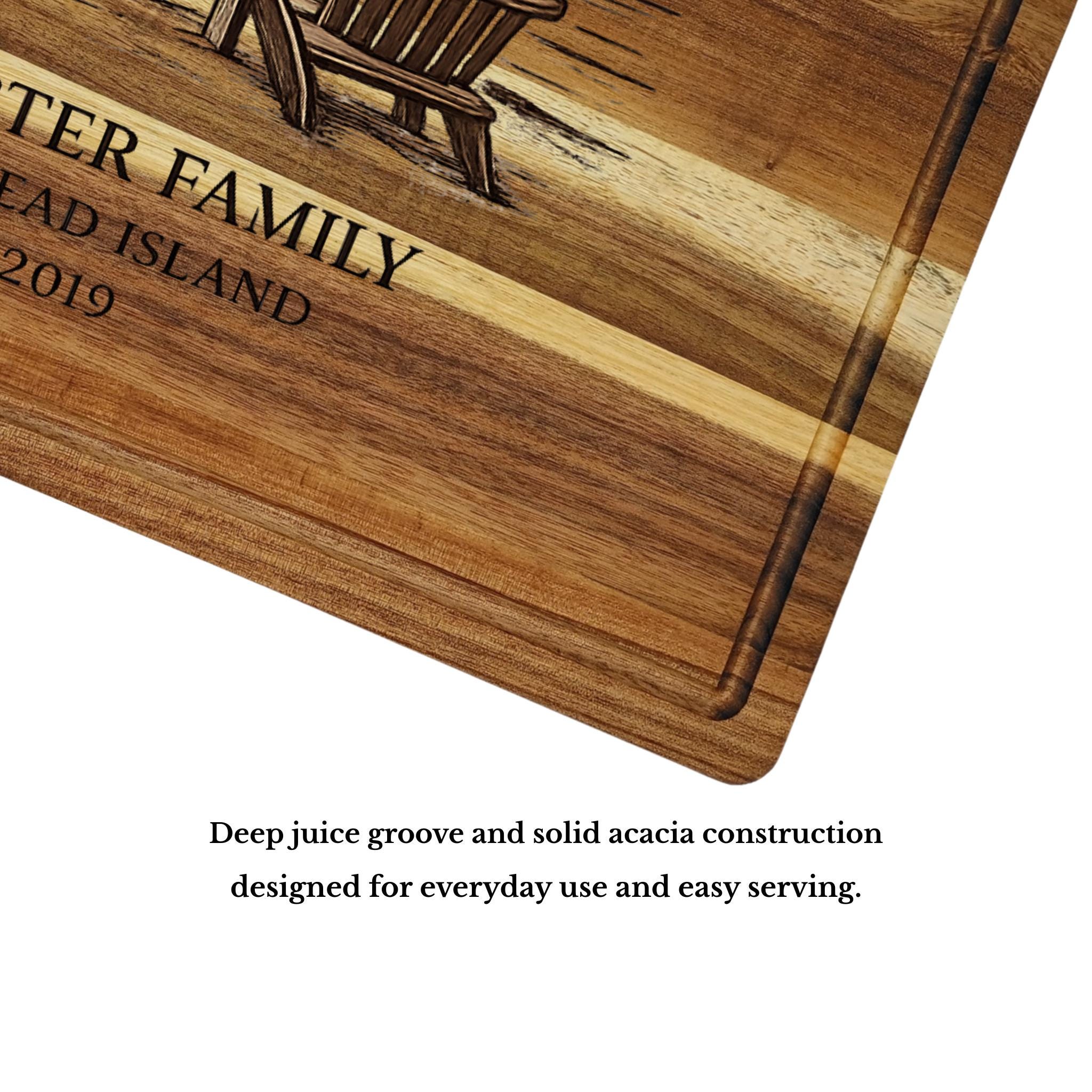 Personalized beach house cutting board crafted from premium acacia wood and custom engraved with a serene coastal scene featuring an Adirondack chair overlooking the ocean. Add your family name, location, and year to create a one-of-a-kind piece that captures your favorite place.