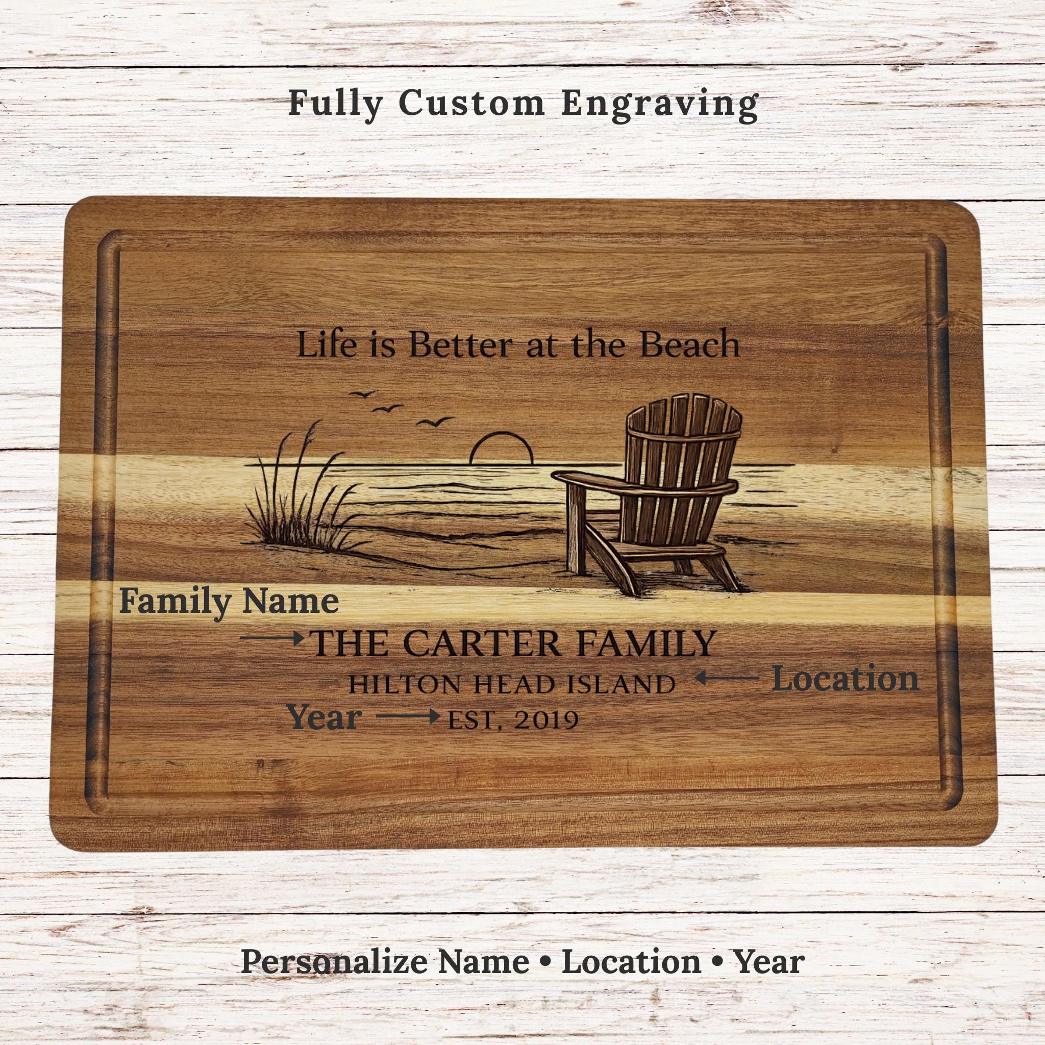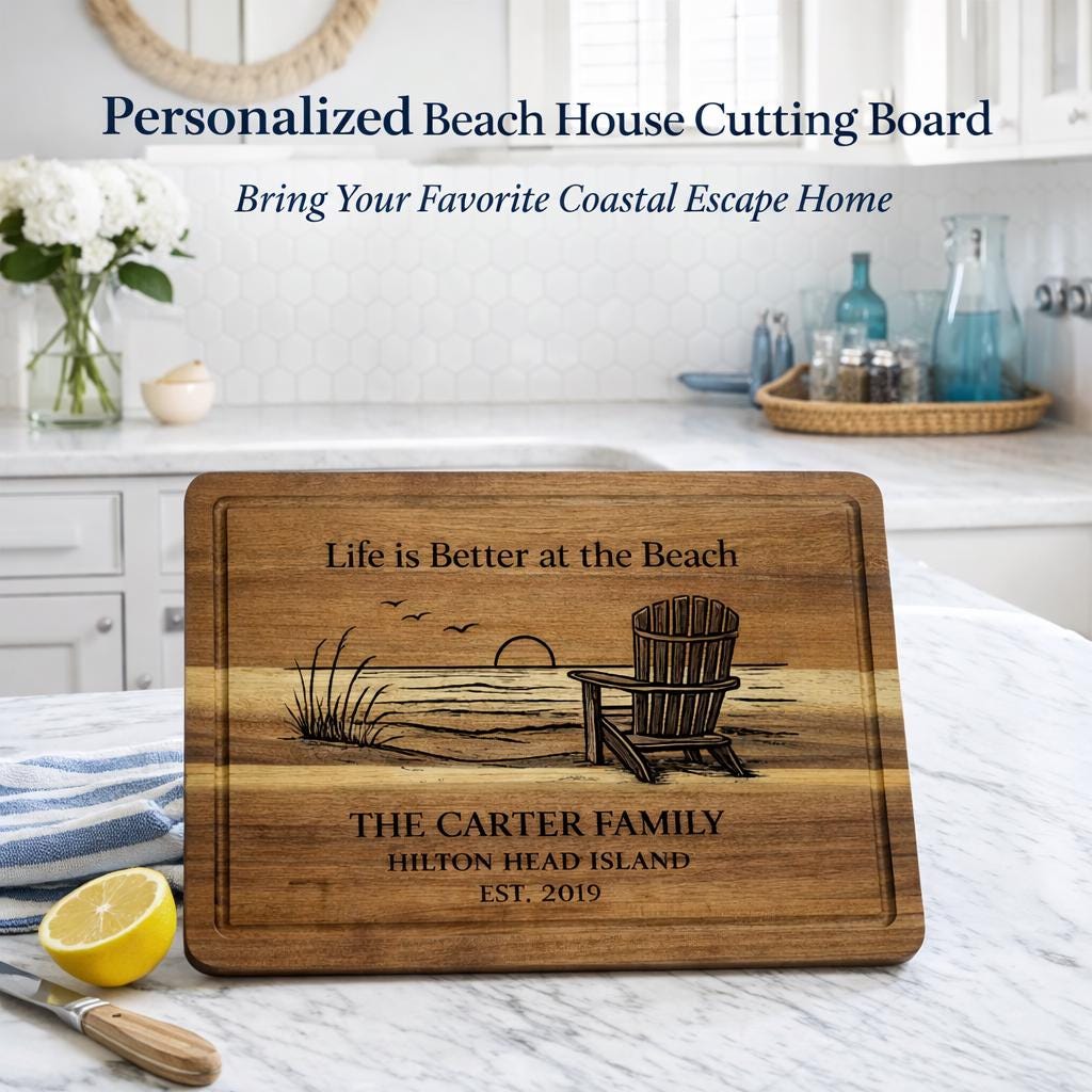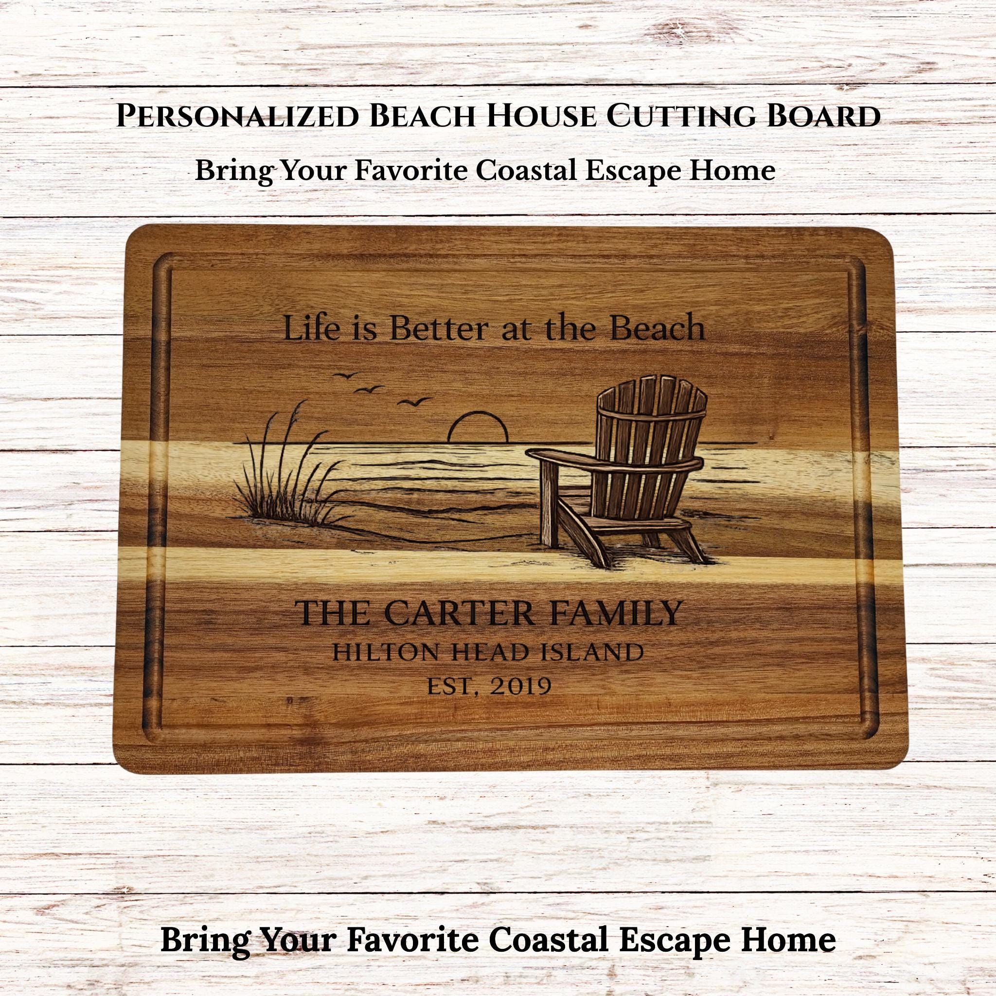This custom cutting board makes a meaningful gift for weddings, housewarmings, anniversaries, and anyone who loves beach house or coastal decor.