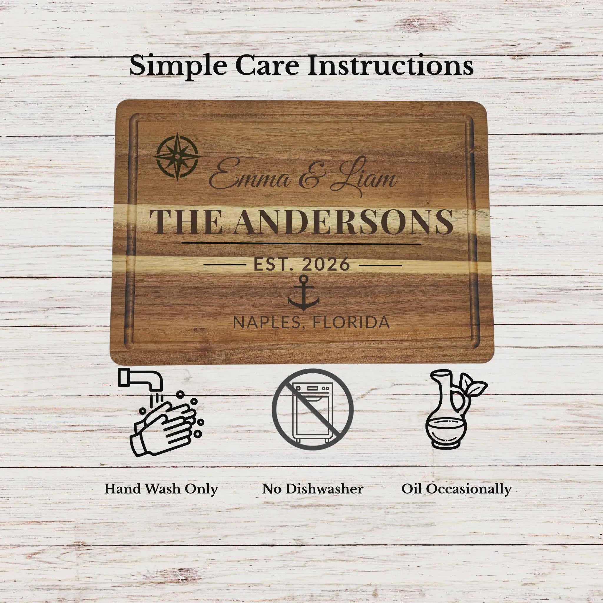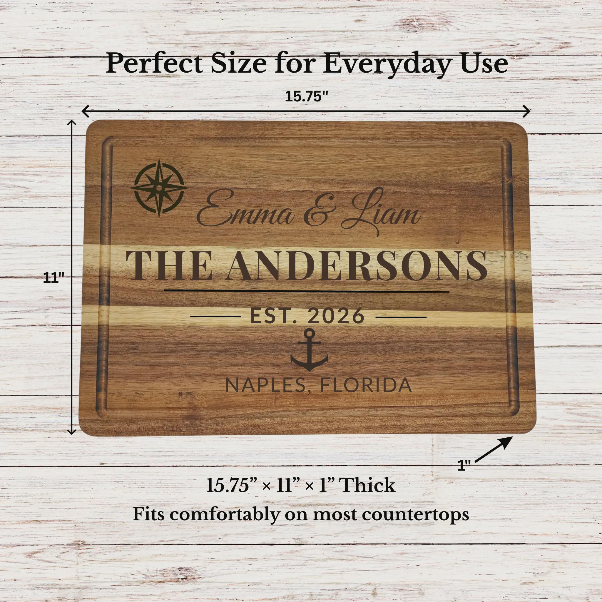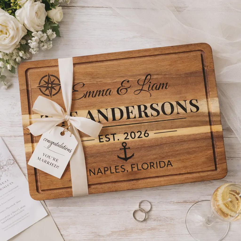 Celebrate a new chapter with a personalized wedding cutting board engraved with your names, date, and location. This custom engraved cutting board is designed to be both a meaningful keepsake and a functional piece for everyday use.