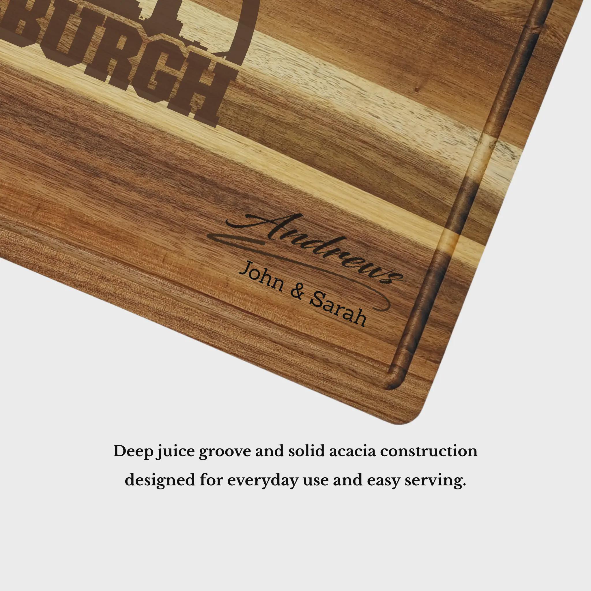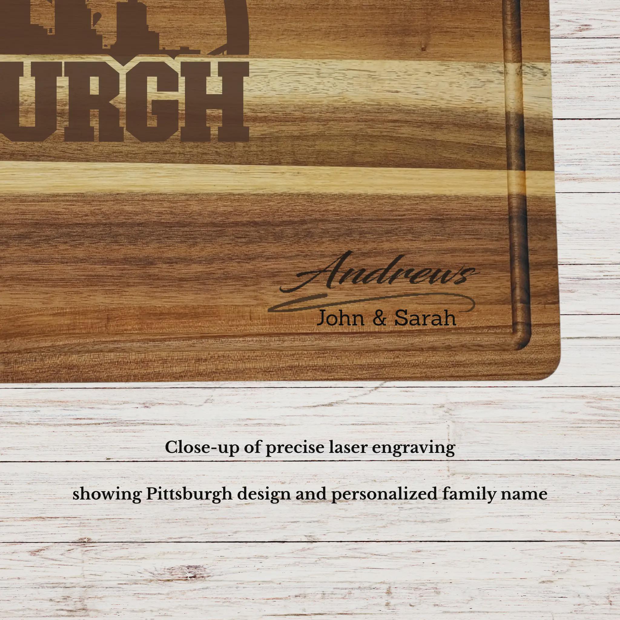 Celebrate Pittsburgh baseball with a personalized cutting board engraved on premium acacia wood. Custom made with your family name, this piece is both a functional kitchen essential and a meaningful keepsake.