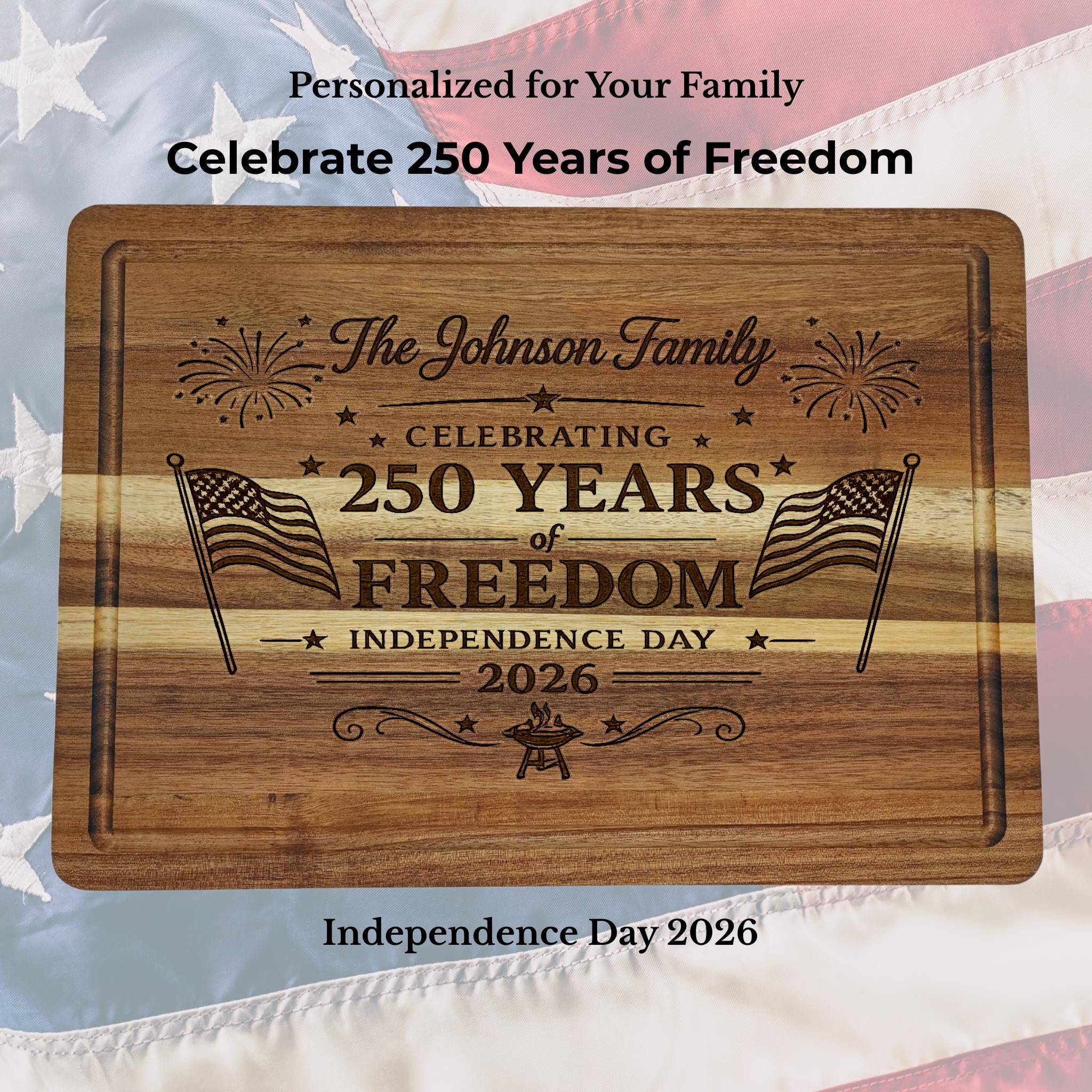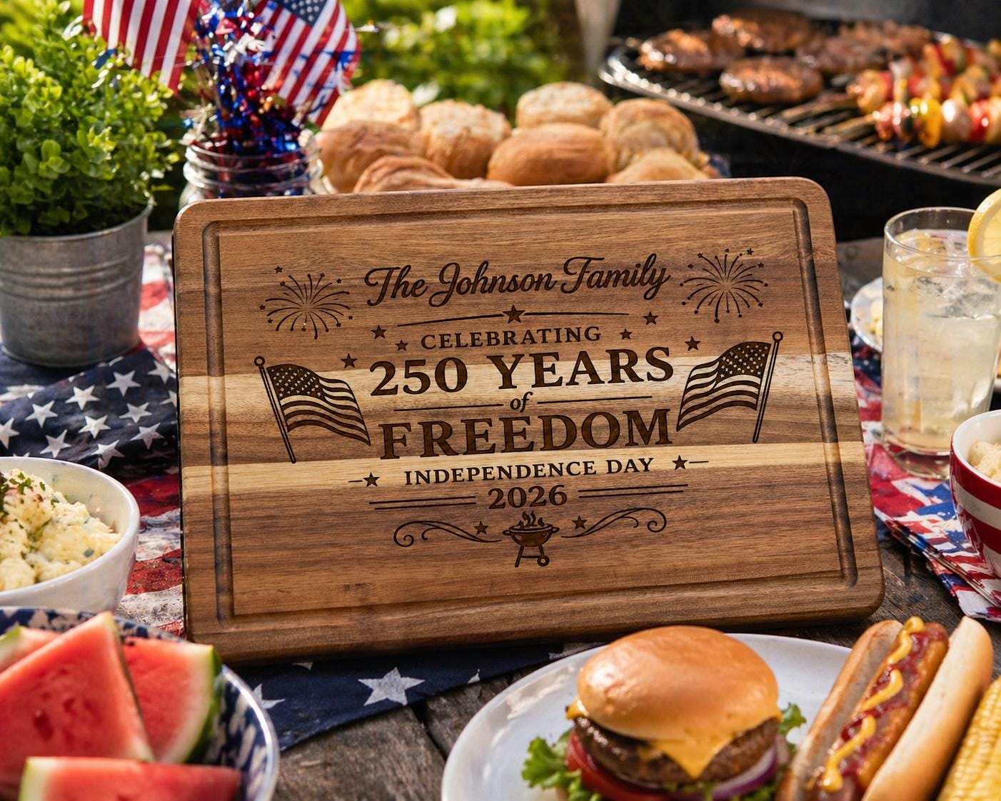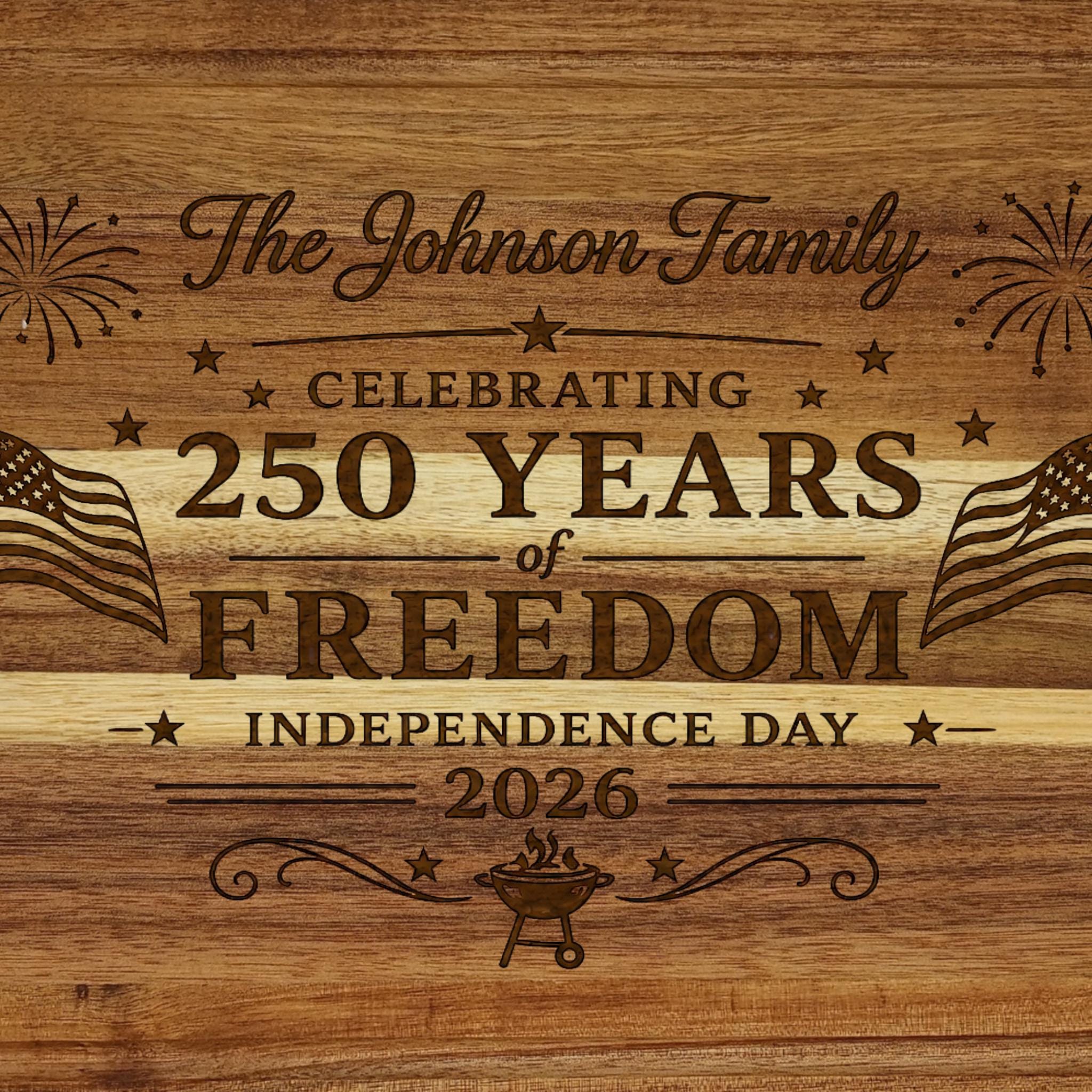 Celebrate America’s 250th anniversary with a personalized cutting board engraved just for your family. Whether it’s for a backyard BBQ, lake house gathering, or meaningful keepsake, this custom board is designed to bring people together and honor 250 years of freedom.