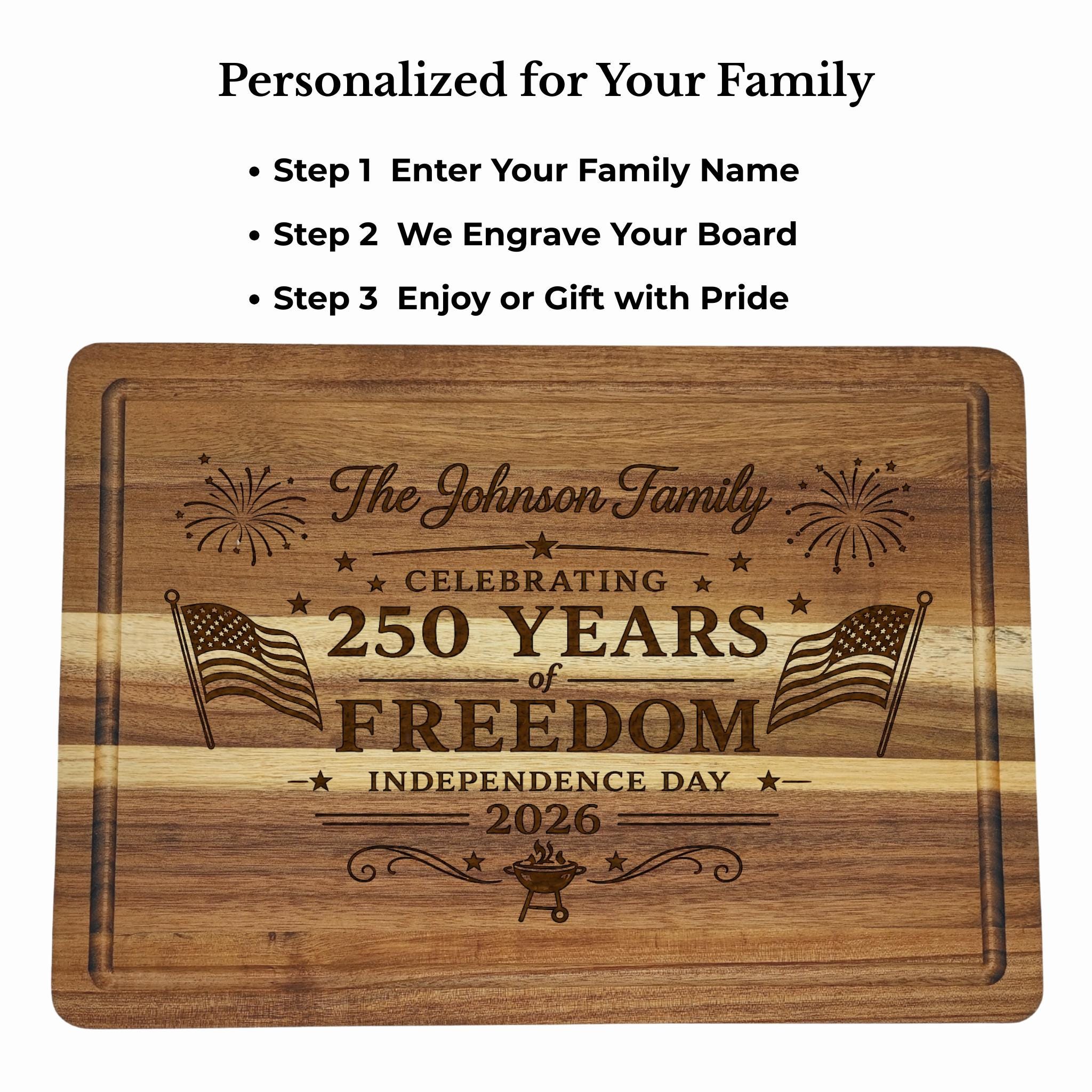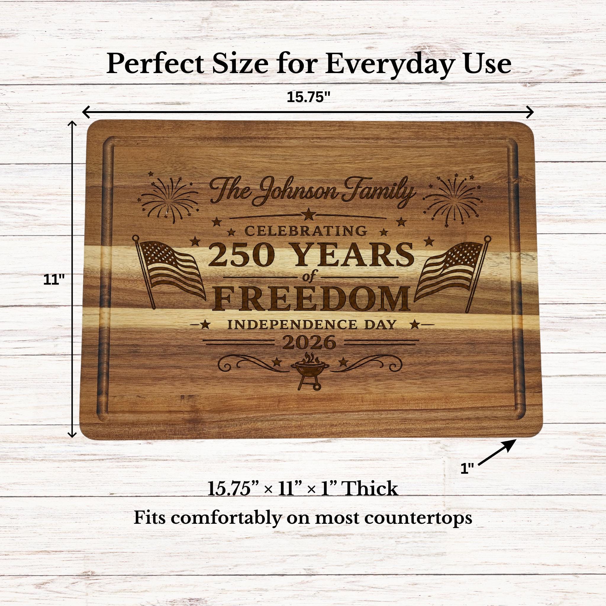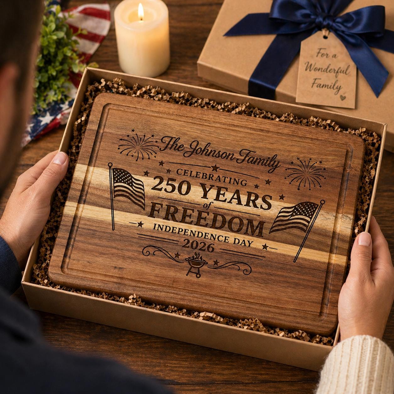 Celebrate America’s 250th anniversary with a personalized cutting board engraved just for your family. Whether it’s for a backyard BBQ, lake house gathering, or meaningful keepsake, this custom board is designed to bring people together and honor 250 years of freedom.